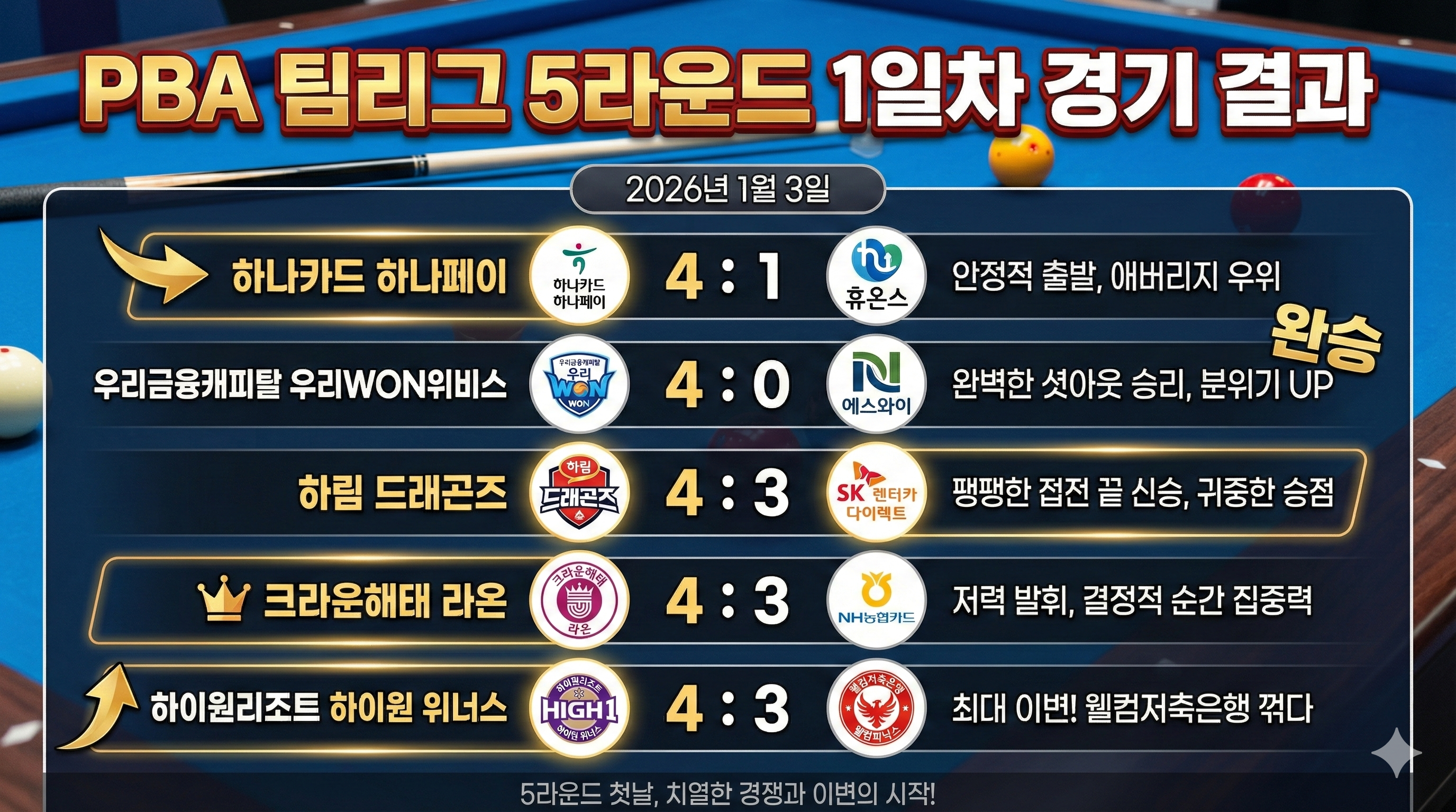 2025-2026시즌 웰컴저축은행 PBA 팀리그 5라운드가 1월 3일 개막하며, 포스트시즌 진출팀을 가리는 마지막 경쟁이 본격적으로 시작됐습니다. 5라운드 1일차 경기 결과와 현재 팀 순위, 그리고 남은 일정 속 향후 전망을 차분히 정리해드립니다.