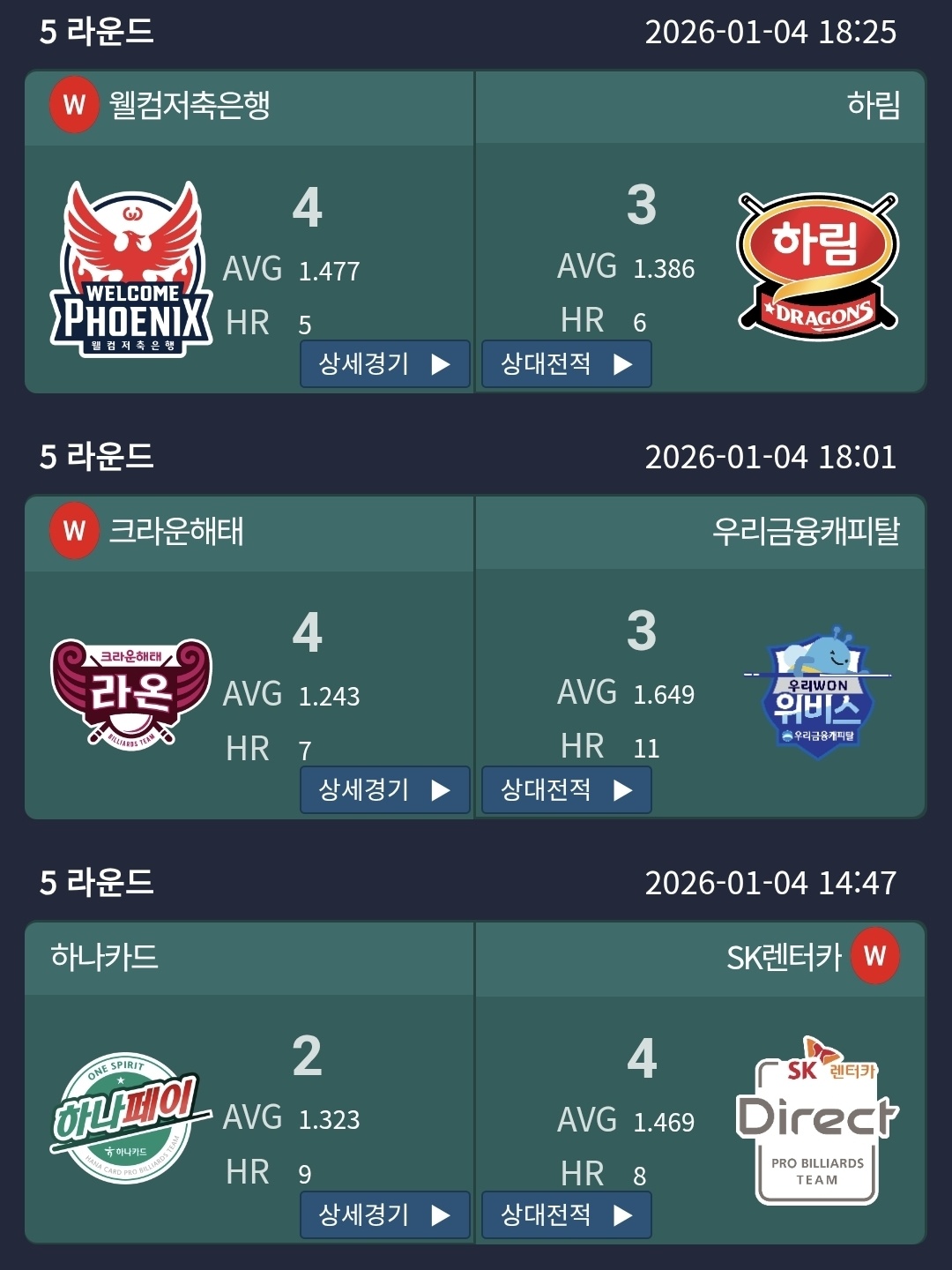 남은 5라운드 일정 속에서 어떤 팀이 상승세를 이어갈지, 또 어떤 팀이 반전을 만들어낼지 지켜보는 것이 이번 시즌 PBA 팀리그의 가장 큰 관전 포인트가 될 것입니다.