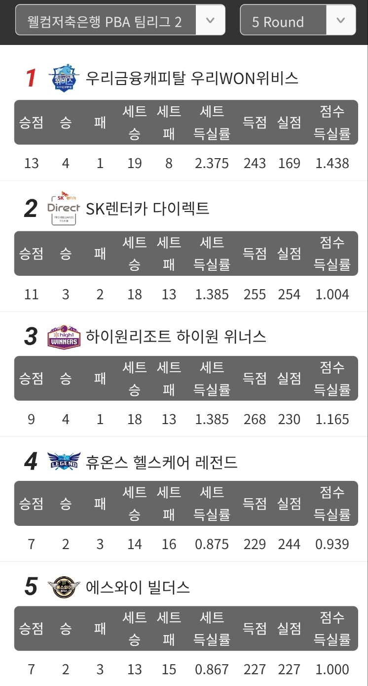 PBA 팀리그 5라운드 5일차 경기결과 및 팀 순위