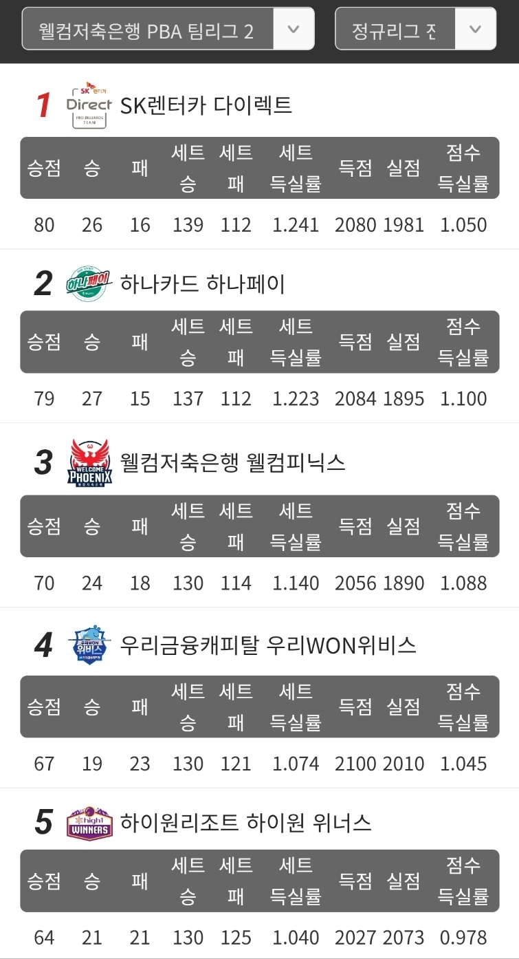 3위에는 웰컴저축은행 웰컴피닉스가 자리하고 있습니다. 웰컴저축은행은 시즌 중반 다소 기복을 보였으나, 5라운드에 들어서며 팀 전반의 집중력이 눈에 띄게 살아났습니다. 이어 우리금융캐피탈 우리WON위비스는 공격적인 경기 운영과 높은 평균 득점력을 바탕으로 상위권 경쟁을 이어가고 있으며, 하이원리조트 하이원 위너스 역시 중상위권에서 꾸준히 순위를 유지하고 있습니다.