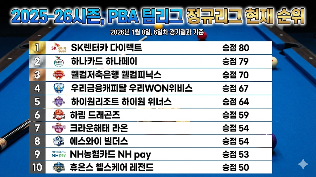 PBA 팀리그 5라운드가 막바지로 향하며 정규리그 판도가 빠르게 정리되고 있습니다. 본 글에서는 1월 8일 6일차 경기결과를 기준으로 한 정규리그 순위와 함께, 포스트시즌 진출팀 전망과 향후 일정까지 한눈에 정리해드립니다.
