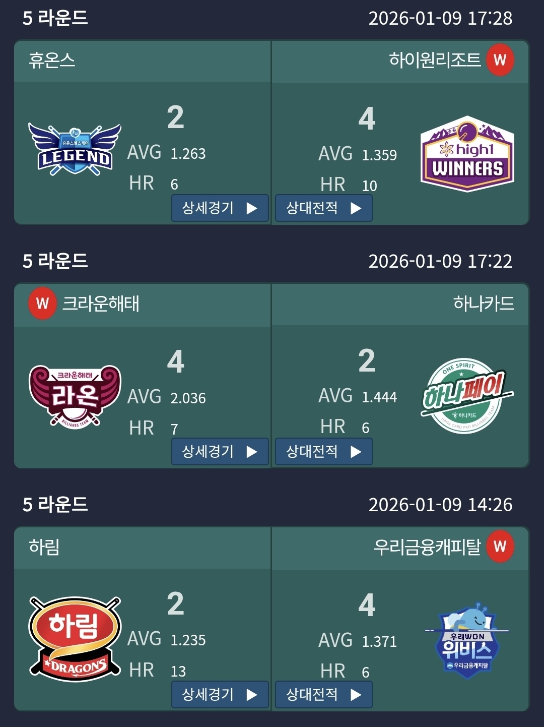 중위권에서는 SK렌터카 다이렉트, NH농협카드 NH pay, 하나카드 하나페이가 촘촘하게 경쟁을 펼치고 있습니다. 승점 차이가 크지 않아 마지막 경기 결과에 따라 포스트시즌 진출 여부가 갈릴 수 있는 만큼, 5라운드 후반부가 더욱 중요해졌습니다.