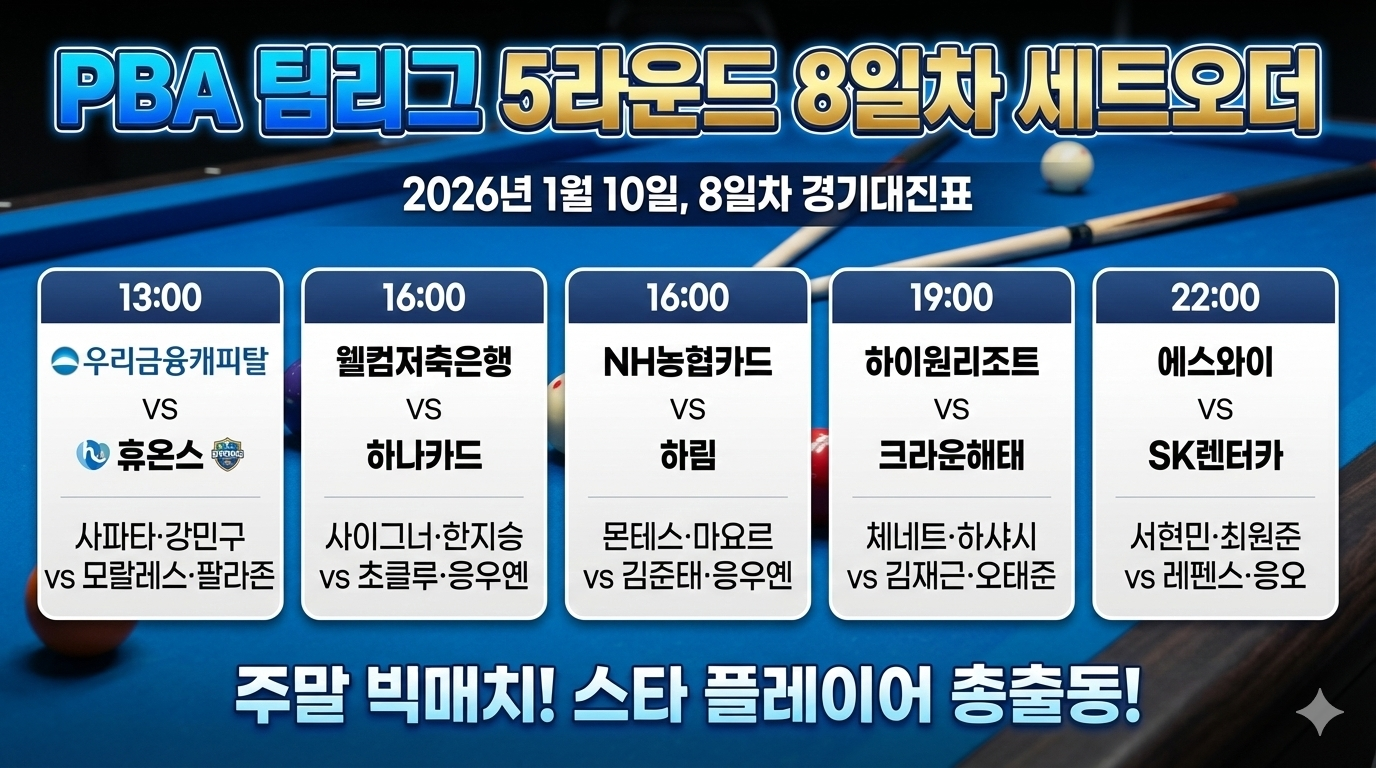 프로당구 팬 여러분께 2025-2026시즌 웰컴저축은행 PBA 팀리그 5라운드 8일차 경기 세트오더를 정리해드립니다. 포스트시즌 진출팀이 확정되는 중요한 길목에서 각 팀이 어떤 선수 조합과 전략을 선택했는지 한눈에 파악할 수 있는 글입니다.