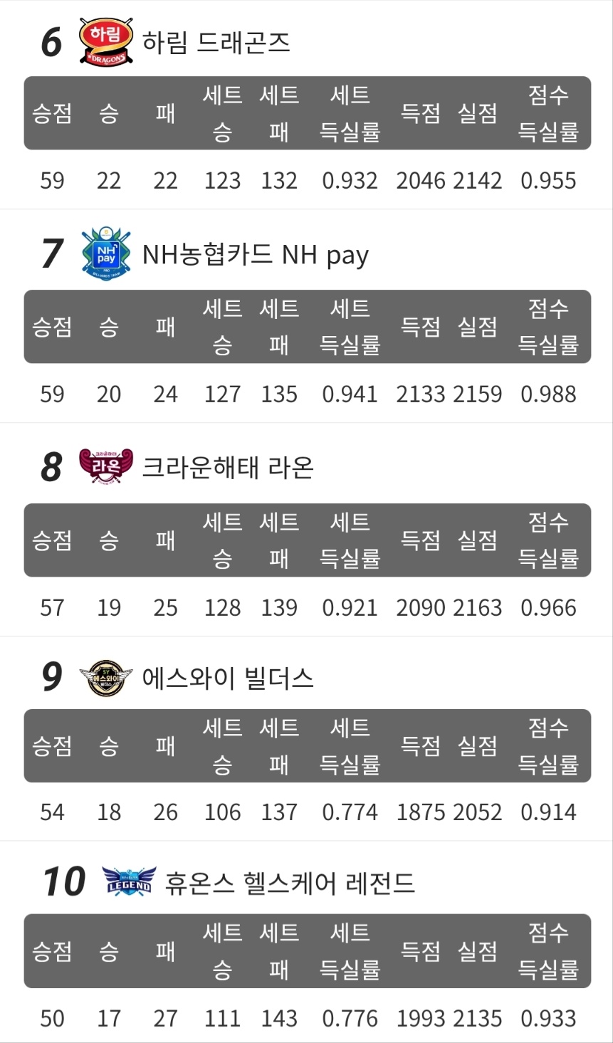 이밖에 하이원리조트 하이원 위너스, 하림 드래곤즈, NH농협카드 NH pay, 크라운해태 라온, 에스와이 빌더스, 휴온스 헬스케어 레전드가 그 뒤를 잇고 있습니다. 중하위권 팀들 역시 마지막 경기까지 치열한 승부를 펼치며 시즌을 마무리하고 있습니다.