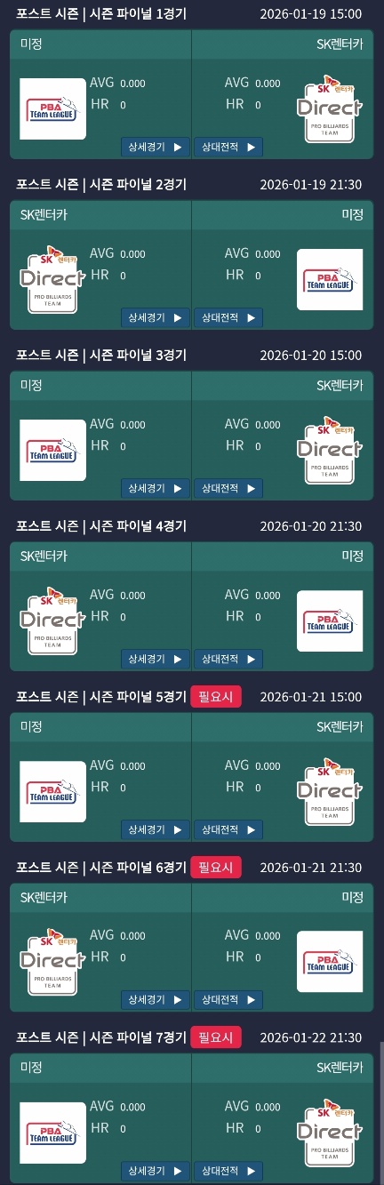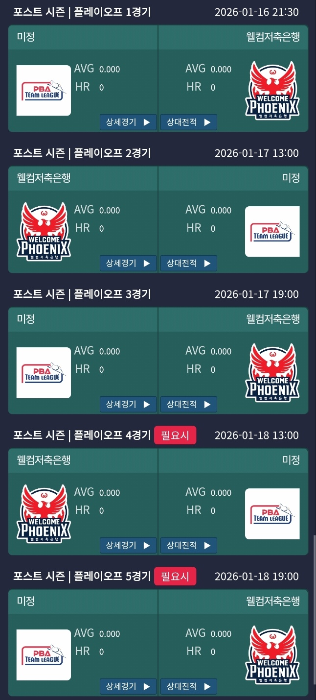 이번 PBA 팀리그 포스트시즌은 정규리그 성적의 가치, 단기전 특유의 변수, 그리고 팀 전략의 완성도를 동시에 확인할 수 있는 무대입니다. 프로당구 팬 여러분의 많은 관심과 응원이 선수들에게 큰 힘이 될 것입니다. 다음 글에서는 포스트시즌 경기별 세트오더와 상세 경기 결과를 전해드릴 예정이니, 계속해서 기대해 주시기 바랍니다.