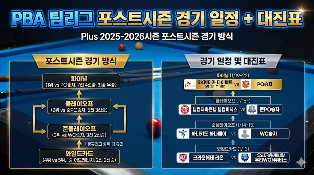 2025-2026시즌 웰컴저축은행 PBA 팀리그 정규리그와 5라운드가 모두 종료되며, 이제 시즌의 하이라이트인 포스트시즌이 본격적으로 시작됩니다. 이번 글에서는 PBA 팀리그 포스트시즌의 경기방식과 전체 일정, 그리고 확정된 대진 구도를 한눈에 이해할 수 있도록 정리해 드립니다. 포스트시즌을 처음 접하는 팬분들께도 유익한 안내가 될 수 있도록 구성했습니다.
