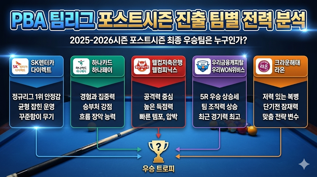 2025-2026시즌 웰컴저축은행 PBA 팀리그 정규리그와 5라운드가 모두 마무리되며, 이제 모든 시선은 포스트시즌으로 향하고 있습니다. 이번 글에서는 포스트시즌에 진출한 다섯 개 프로당구팀의 전력을 객관적으로 비교 분석하여, 각 팀의 강점과 변수, 그리고 우승 가능성을 살펴보겠습니다.