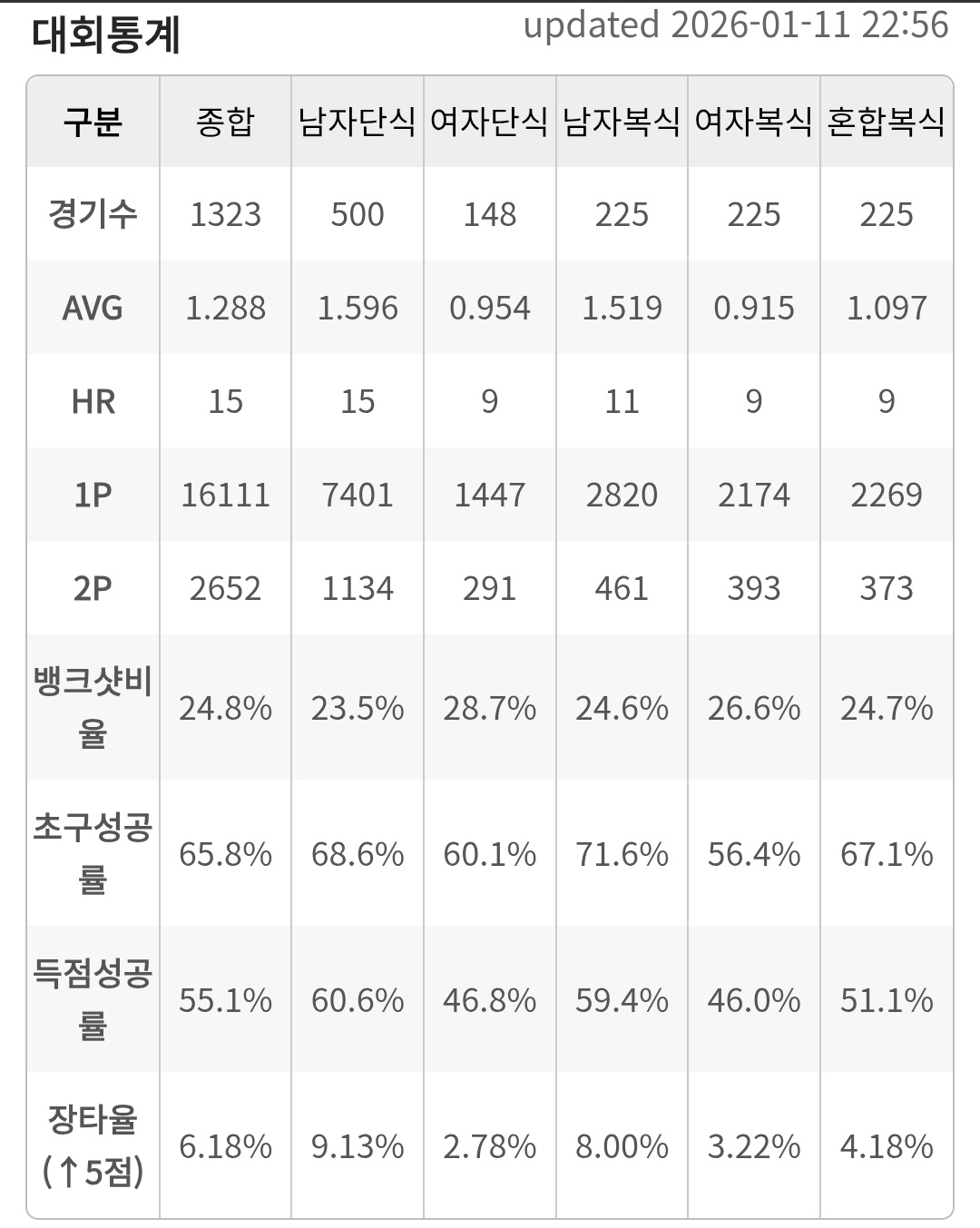 정규리그 전체 평균 애버리지는 1.288로 집계되었습니다. 종목별로 살펴보면 남자 단식 애버리지가 1.596으로 가장 높아 개인 기량의 정점을 보여주었고, 남자 복식 역시 1.519로 높은 수치를 기록했습니다.