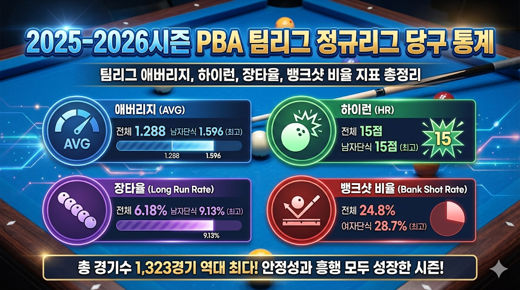 2025-2026시즌 PBA 팀리그 정규리그를 수치로 정리해보았습니다. 경기 수부터 애버리지, 하이런, 뱅크샷 비율과 장타율까지 살펴보며 시즌 흐름과 리그의 변화를 이해하는 데 도움이 되는 통계 안내 글입니다.