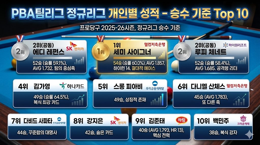 2025-26시즌 PBA 팀리그 정규리그를 기준으로 개인 성적을 살펴보면, 팀 성적과는 또 다른 흥미로운 흐름이 보입니다. 이번 글에서는 승수 기준으로 상위 10위에 오른 선수들의 기록을 중심으로, 각 선수의 경기 스타일과 팀 기여도를 함께 분석해봅니다. 팀리그를 더 깊이 이해하는 데 도움이 되는 개인 성적 분석 글입니다.