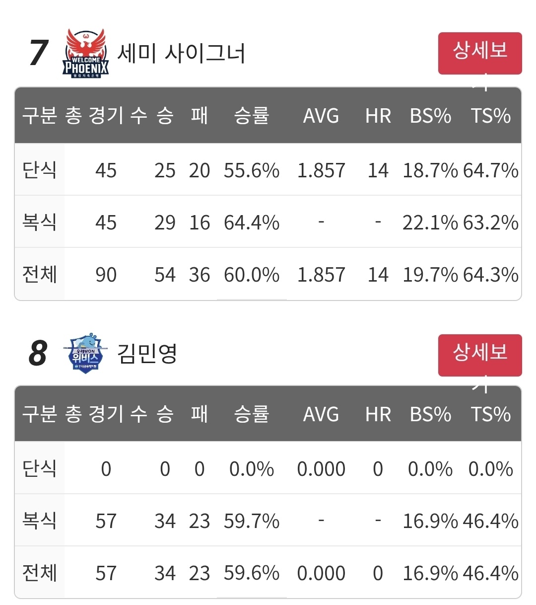 세미 사이그너 선수는 승수에서는 최상위권을 기록했으며, 승률 역시 60%로 Top10에 포함되었습니다. 평균 애버리지 1.857, 하이런 14회는 공격력과 파괴력을 동시에 보여주는 지표입니다.