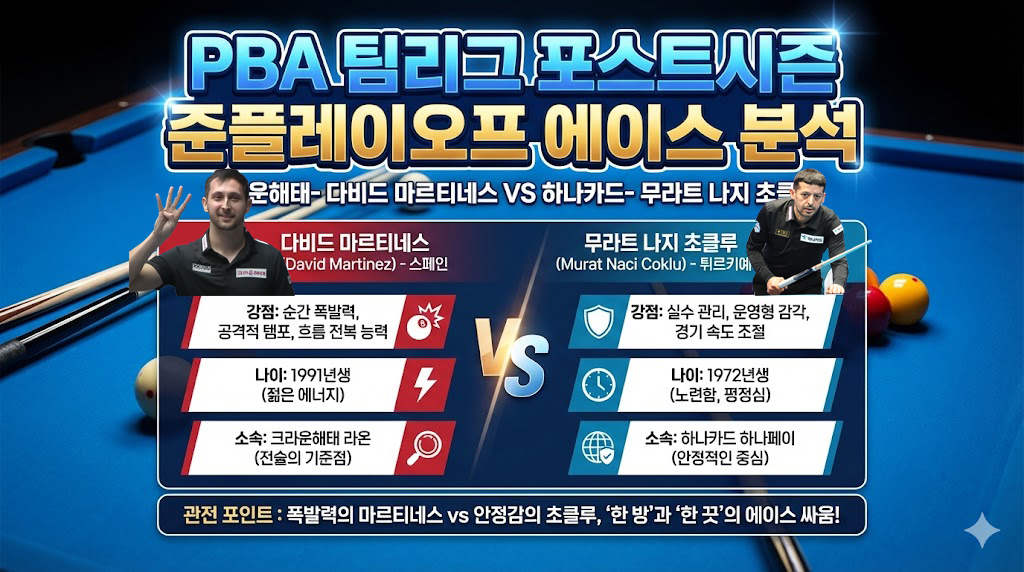 웰컴저축은행 PBA 팀리그 2025-2026 포스트시즌에서 ‘준플레이오프’는 사실상 에이스 싸움이 먼저 판을 짭니다. 크라운해태 라온의 다비드 마르티네스와 하나카드 하나페이의 무라트나지 초클루는 국적과 세대, 커리어 결이 확연히 다른 두 축으로, 이번 매치업을 더 흥미롭게 만듭니다. 이 글에서는 두 선수의 프로필 포인트를 바탕으로, 팀리그 단기전에서 어떤 장면을 만들어낼지 ‘에이스 관점’에서 풀어보겠습니다.