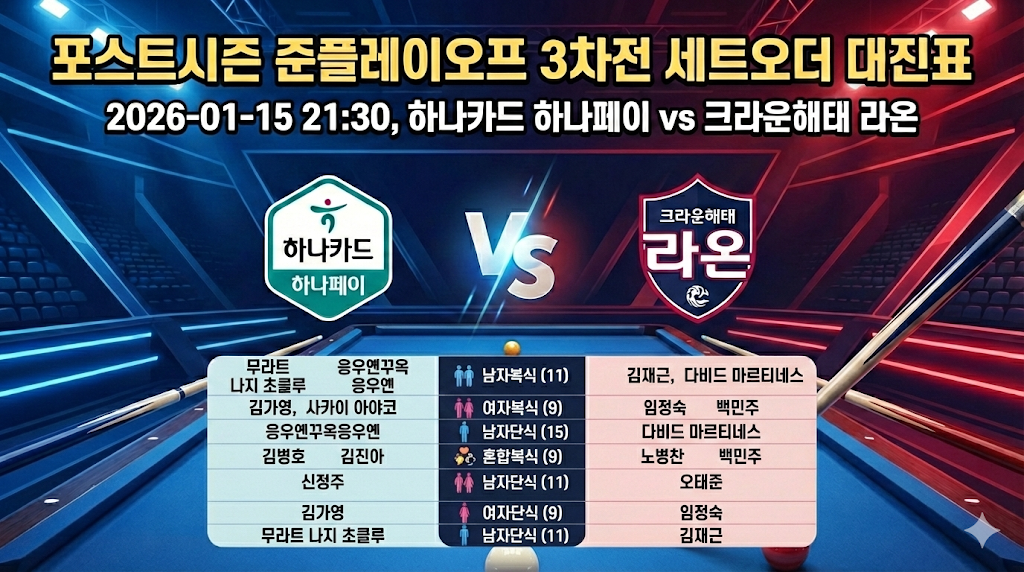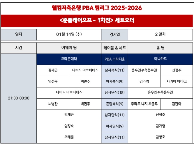 | PBA 팀리그 포스트시즌 준플레이오프 2차전 세트오더 대진표 - 하나카드 vs 크라운해태 당구팀 (0) | 2026.01.15 |