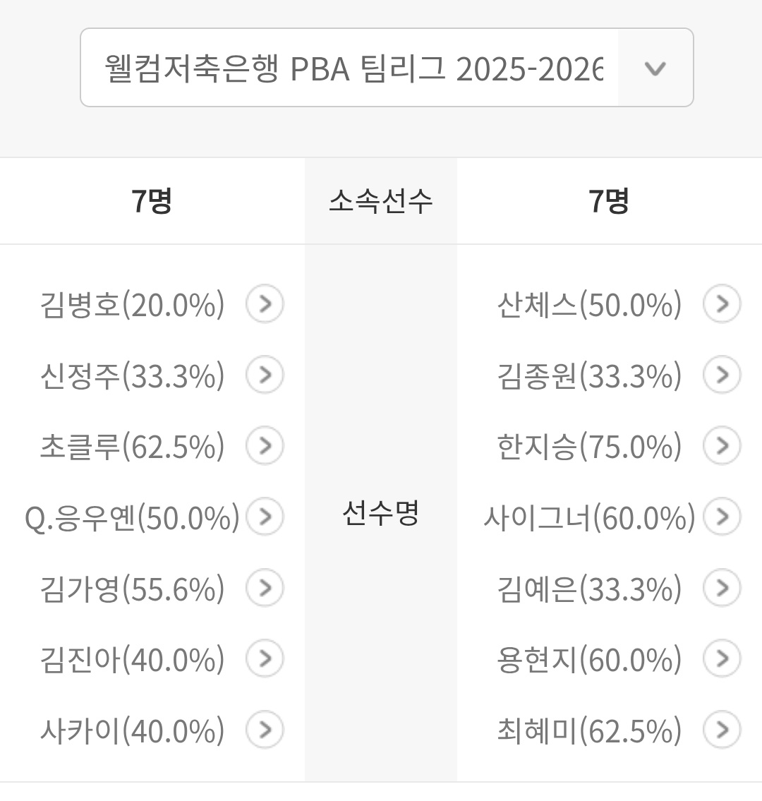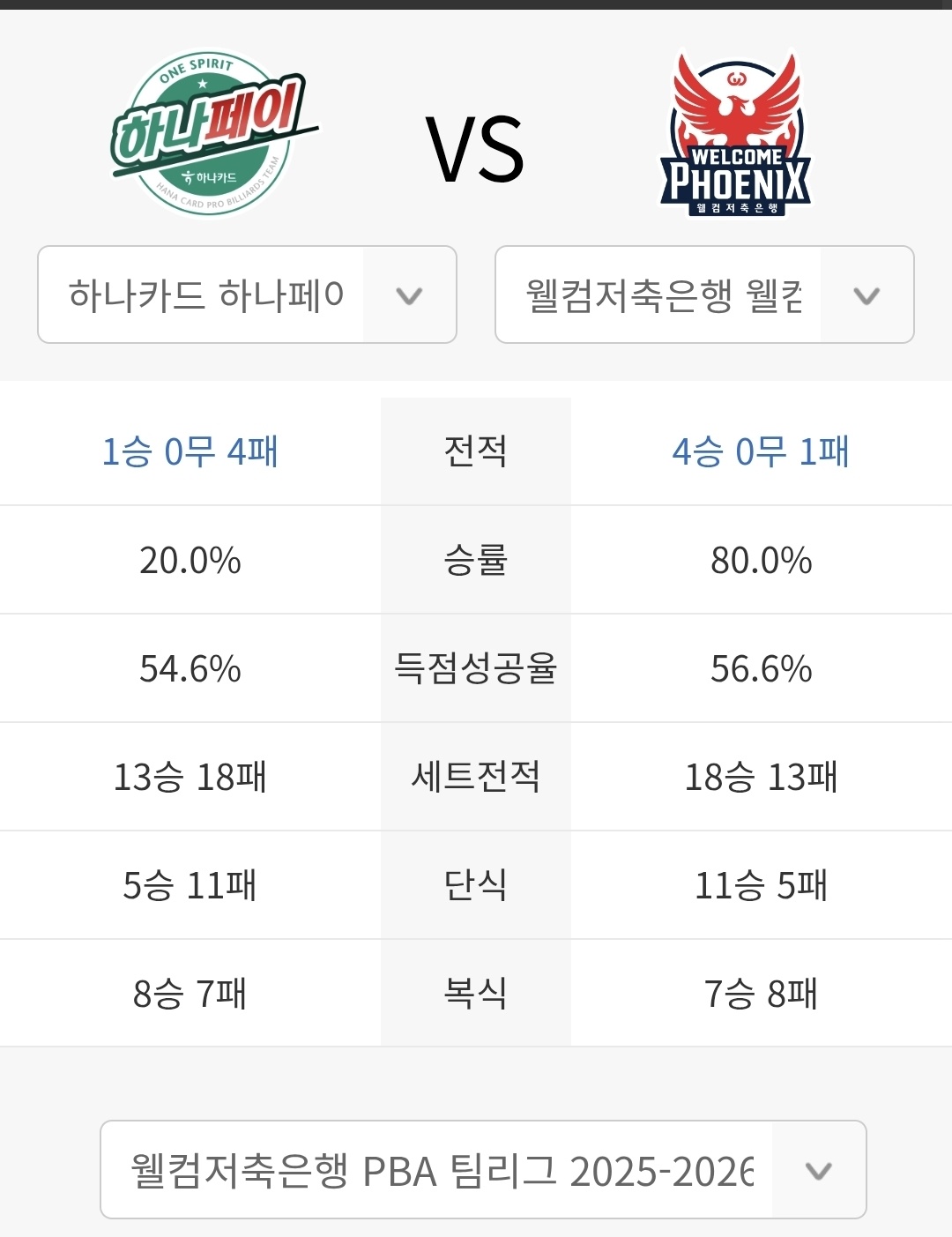 하나카드 vs 웰컴저축은행 소속 선수 승률 비교