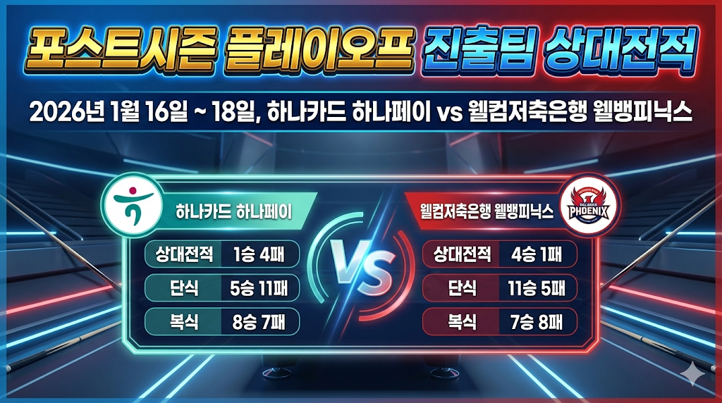 2025-2026시즌 프로당구 PBA 팀리그 포스트시즌은 드디어 플레이오프 단계에 접어들었습니다. 이번 글에서는 플레이오프 진출이 확정된 하나카드 하나페이와 웰컴저축은행 웰뱅피닉스 당구팀의 상대전적과 선수 개인별 승률, 그리고 포스트시즌 플레이오프 경기 일정과 규칙까지 한눈에 이해할 수 있도록 정리해드립니다. 포스트시즌을 더욱 깊이 있게 즐기고 싶은 당구 팬들께 실질적인 도움이 되는 내용이 될 것입니다.