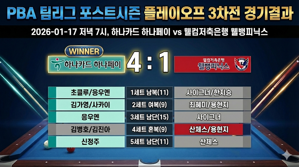 2025-2026시즌 프로당구 PBA 팀리그 포스트시즌 플레이오프 3차전이 1월 17일 저녁 7시, PBA 스타디움에서 펼쳐졌습니다. 이번 경기는 시리즈 흐름을 가를 수 있는 중요한 일전으로, 하나카드 하나페이와 웰컴저축은행 웰뱅피닉스 양 팀 모두 총력전을 예고했던 경기였습니다. 이 글에서는 플레이오프 전체 개요와 함께 3차전 경기 결과를 세트 흐름 중심으로 정리하고, 이어지는 4차전 일정과 전망까지 함께 살펴보겠습니다.
