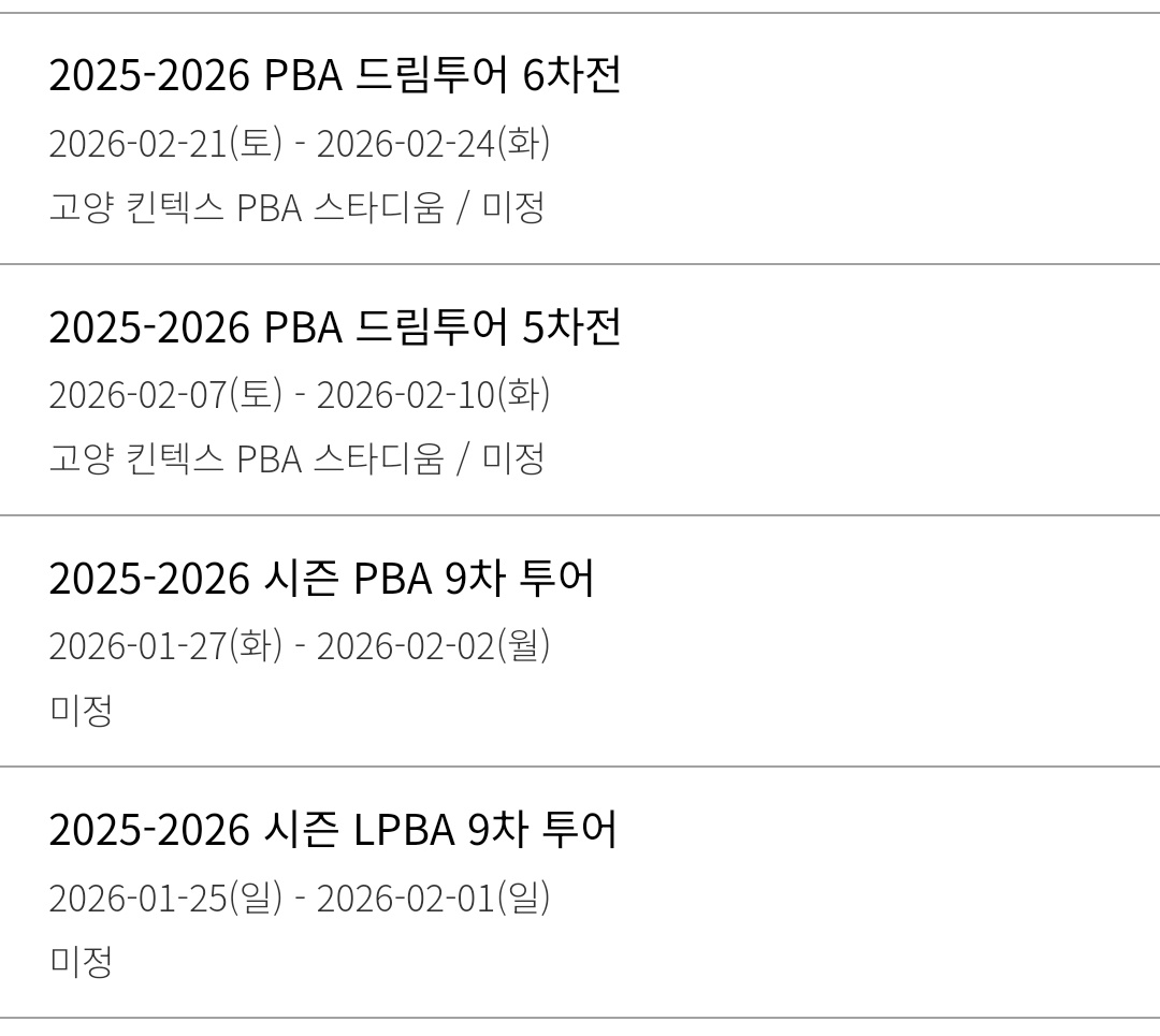 2026년 1월 말에는 PBA와 LPBA 9차 투어가 예정되어 있으며, 시즌 막판 랭킹 경쟁과 상금 레이스가 본격적으로 펼쳐질 전망입니다. 이어 2월에는 드림투어 5차전과 6차전이 고양 킨텍스 PBA 스타디움에서 열릴 예정으로, 차세대 선수들의 치열한 경쟁이 기대되고 있습니다.