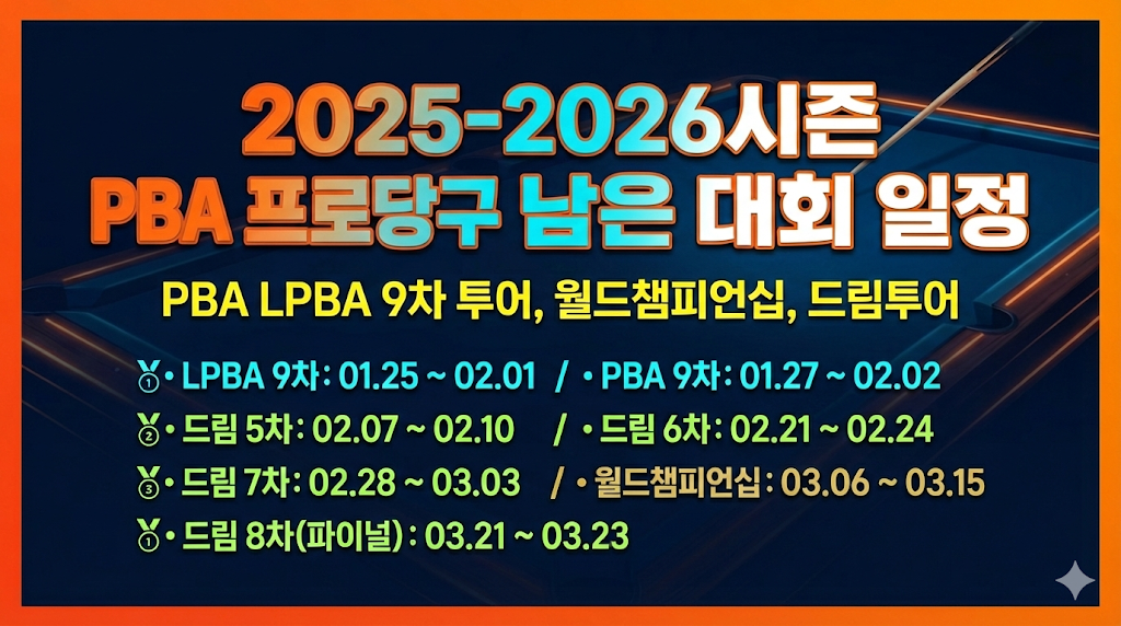 현재 진행 중인 PBA 팀리그 포스트시즌 파이널이 막바지를 향해 가고 있는 가운데, 팬 여러분께서 가장 궁금해하시는 부분은 바로 그 이후 이어질 프로당구 대회 일정일 것입니다. 이번 글에서는 2025-2026시즌의 마지막을 장식하게 될 PBA·LPBA 9차 투어와 월드챔피언십, 그리고 드림투어 일정까지 한눈에 정리해 드립니다. 프로당구 팬이라면 반드시 알아두셔야 할 핵심 정보만을 모아 정리한 만큼, 향후 관람 계획이나 시즌 흐름을 이해하는 데 큰 도움이 될 것입니다.
