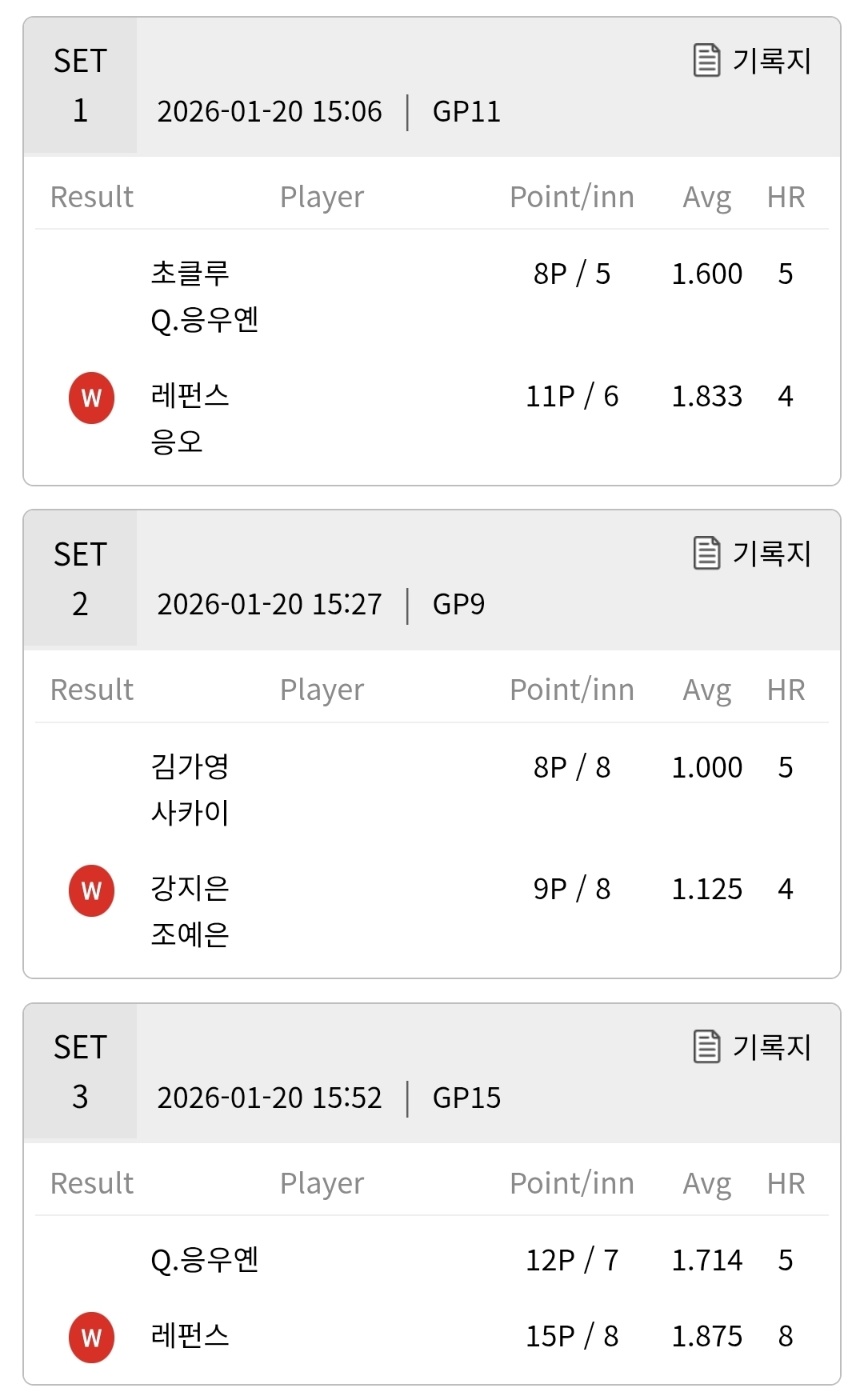 3세트는 남자 복식 15점 경기로 진행됐습니다. 이 세트에서는 하나카드의 Q.응우엔이 15점 8이닝, 평균 1.875를 기록하며 팀 승리에 결정적인 역할을 했습니다. SK렌터카의 레펀스는 5점 7이닝, 평균 0.714에 머물러 3차전에서 보여주었던 공격적인 흐름을 이어가지 못했습니다. 이 세트까지 하나카드는 3세트를 연속으로 가져가며 사실상 승기를 굳혔습니다.