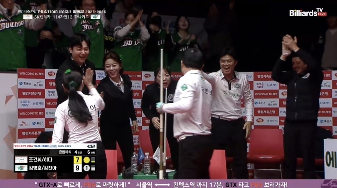 4세트는 혼합 복식 9점 경기로, SK렌터카가 반전을 노릴 수 있는 마지막 기회에 가까운 세트였습니다. 그러나 결과는 하나카드의 김병호-김진아 조가 9점 6이닝, 평균 1.500을 기록하며 승리를 거두었습니다. SK렌터카의 조건휘-히다 조는 7점 6이닝, 평균 1.167로 분전했지만, 결정적인 한두 득점에서 흐름을 뒤집지 못했습니다. 이 세트 승리로 하나카드는 4차전 승리를 확정지었습니다.