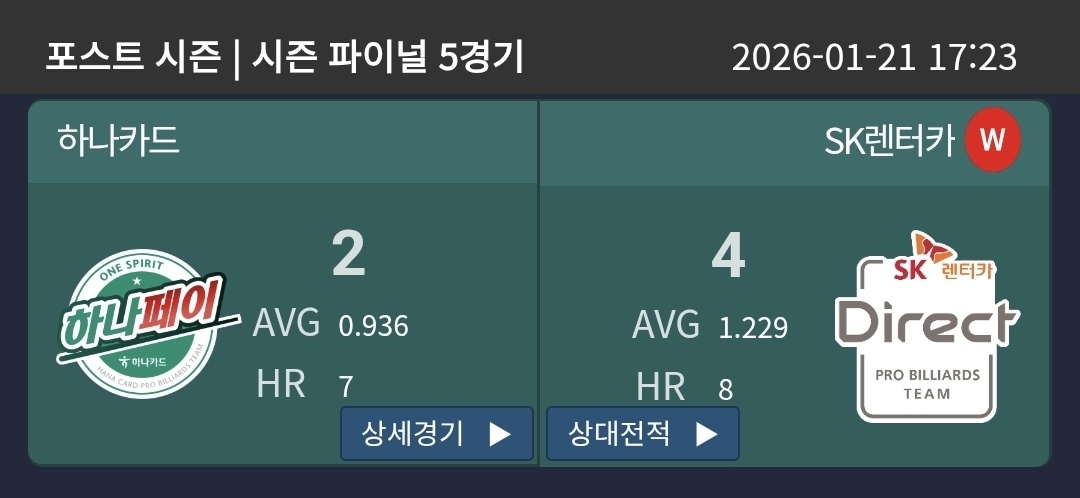 | PBA 팀리그 포스트시즌 파이널 6차전 경기결과 - 하나카드 당구팀 4승 2패로 우승 (0) | 2026.01.22 |