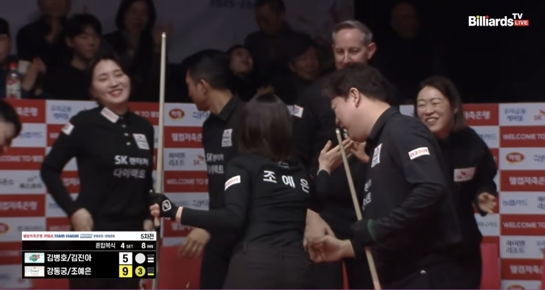 4세트는 혼합 복식 9점 경기로 치러졌습니다. SK렌터카의 강동궁-조예은 조가 9점 8이닝, 평균 1.125를 기록하며 승리를 거뒀습니다. 하나카드의 김병호-김진아 조는 5점 7이닝, 평균 0.714로 분전했지만, 중반 이후 이어진 공격 흐름을 막아내지 못했습니다. 이 세트 승리는 SK렌터카가 다시 한 번 우위를 점하는 계기가 됐습니다.