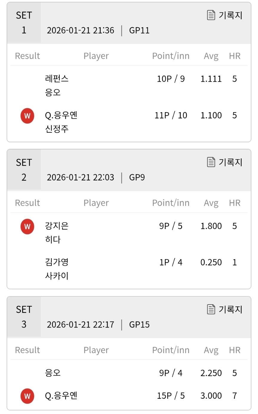 3세트는 남자 단식 15점 경기였습니다. SK렌터카의 응오는 9점 4이닝, 평균 2.250으로 공격력을 보여줬지만, 하나카드의 Q.응우엔이 15점 5이닝, 평균 3.000이라는 압도적인 경기력으로 세트를 마무리했습니다. 이 승리로 하나카드는 분위기를 완전히 장악했습니다.