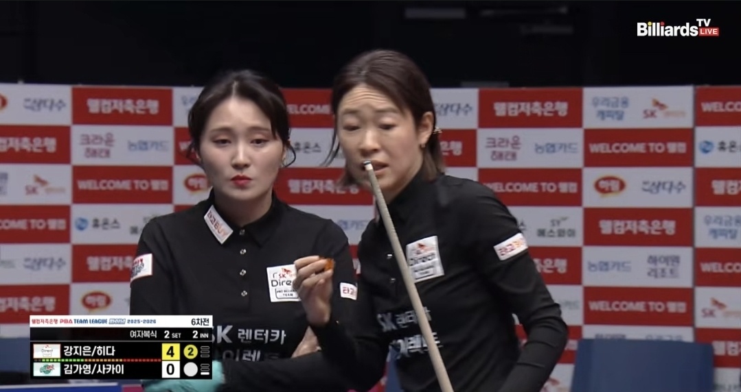 4세트는 혼합 복식 9점 경기로 이어졌습니다. SK렌터카의 강동궁–조예은 조는 2점 2이닝에 그쳤고, 하나카드의 초클루–사카이 조가 9점 2이닝, 평균 4.500이라는 폭발적인 공격력으로 단숨에 세트를 가져갔습니다. 파이널 6차전의 흐름을 상징하는 장면이었습니다.