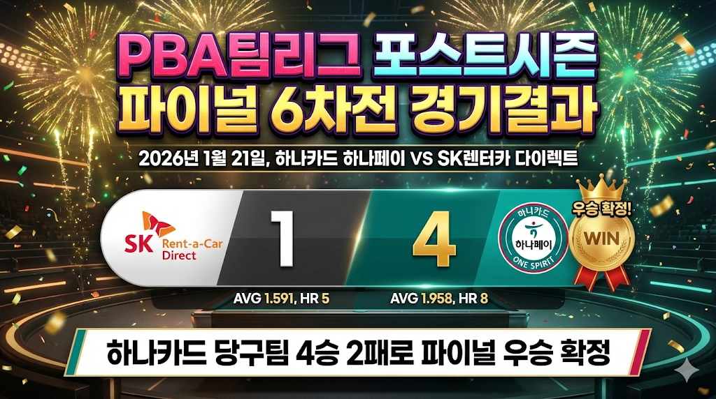 2026년 1월 21일 밤 9시 30분에 펼쳐진 PBA 팀리그 포스트시즌 파이널 6차전은 2025-2026시즌 팀리그의 최종 우승팀을 가리는 결정적인 경기였습니다. 본 글에서는 파이널 전체 흐름과 함께 6차전 세트별 경기 내용, 그리고 시상 및 상금까지 한눈에 정리해 드립니다.