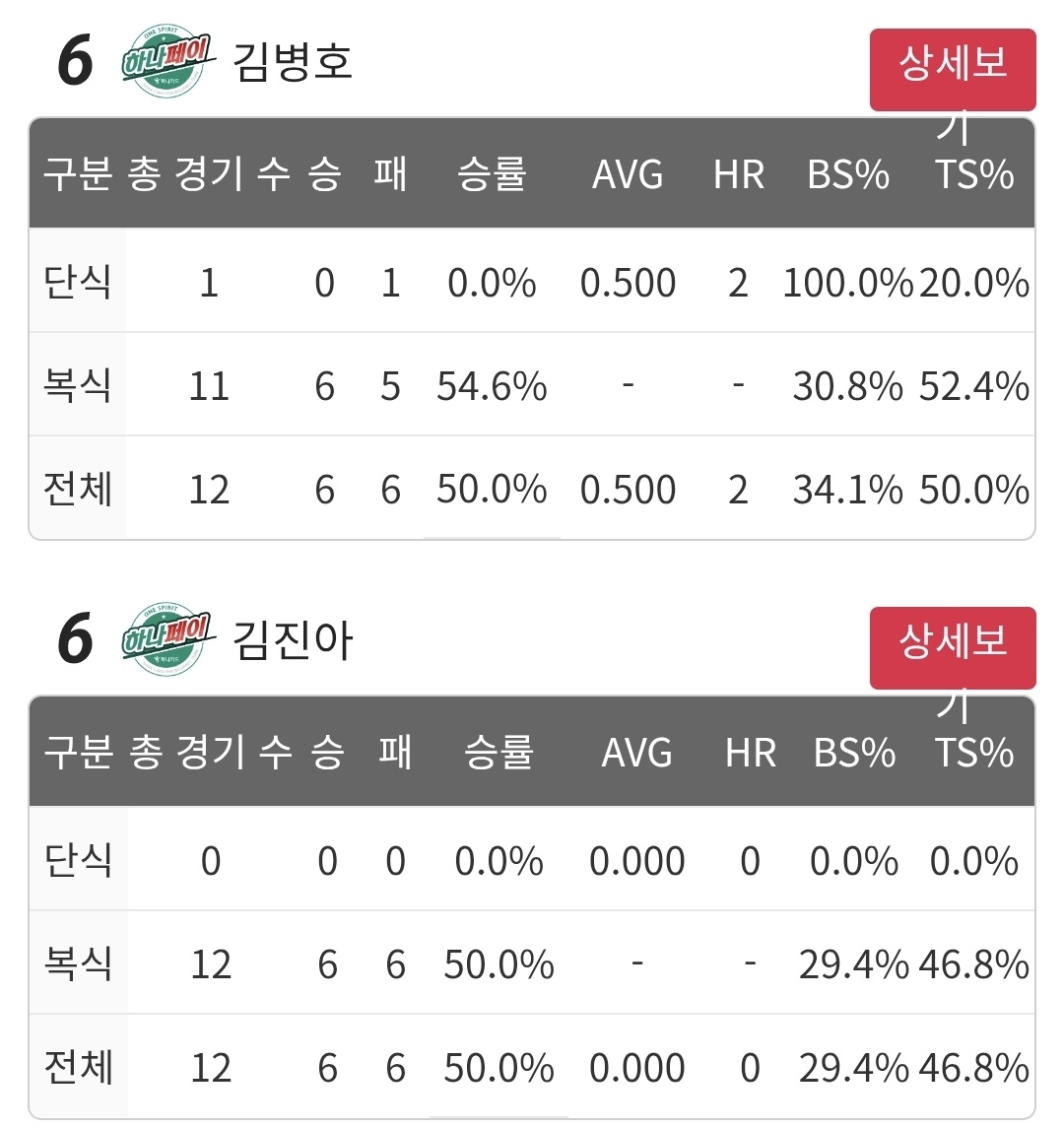 공동 6위에는 임정숙 선수와 김병호 선수가 이름을 올렸습니다. 임정숙 선수는 단식에서 100% 승률을 기록하며 중요한 경기마다 팀 승리에 직접적인 기여를 했습니다. 김병호 선수는 복식 중심의 출전 속에서도 꾸준한 승수 확보로 팀 밸런스를 유지하는 역할을 수행했습니다.