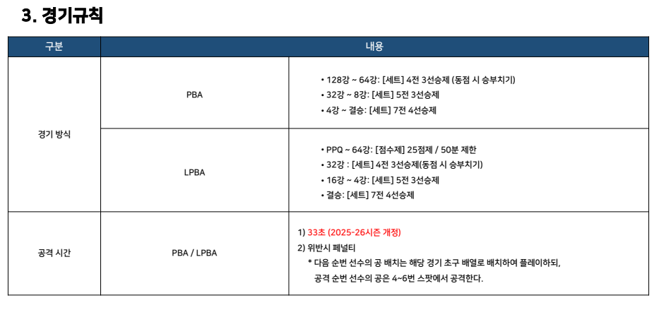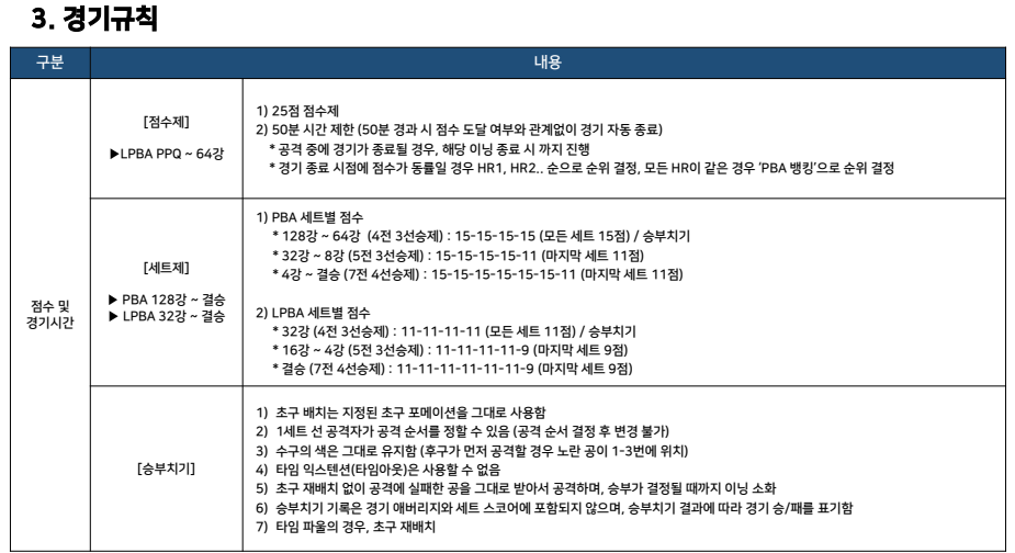 경기 방식은 라운드에 따라 세트제와 점수제가 병행됩니다. PBA는 128강부터 세트제로 진행되며, 라운드가 올라갈수록 세트 수와 승리 조건이 강화됩니다.