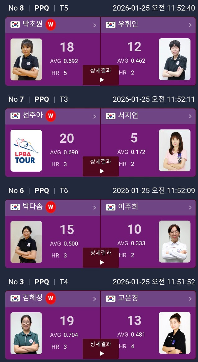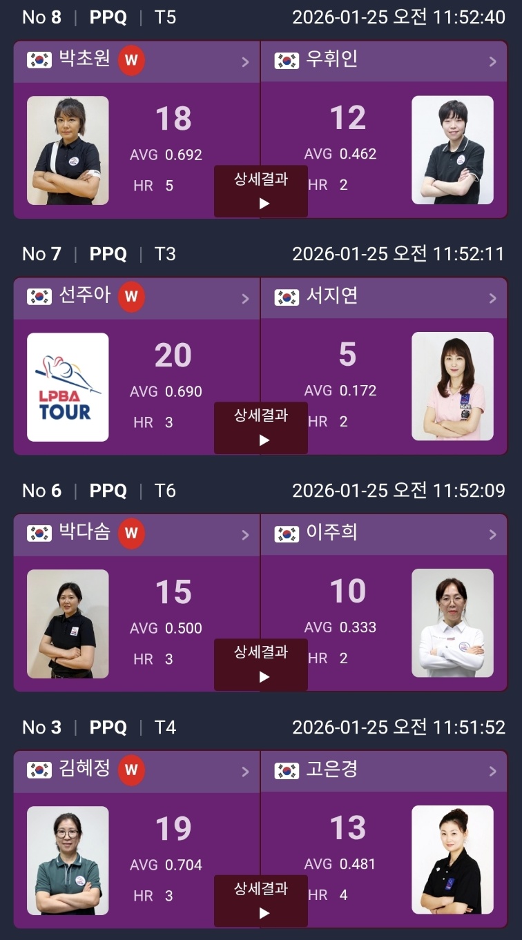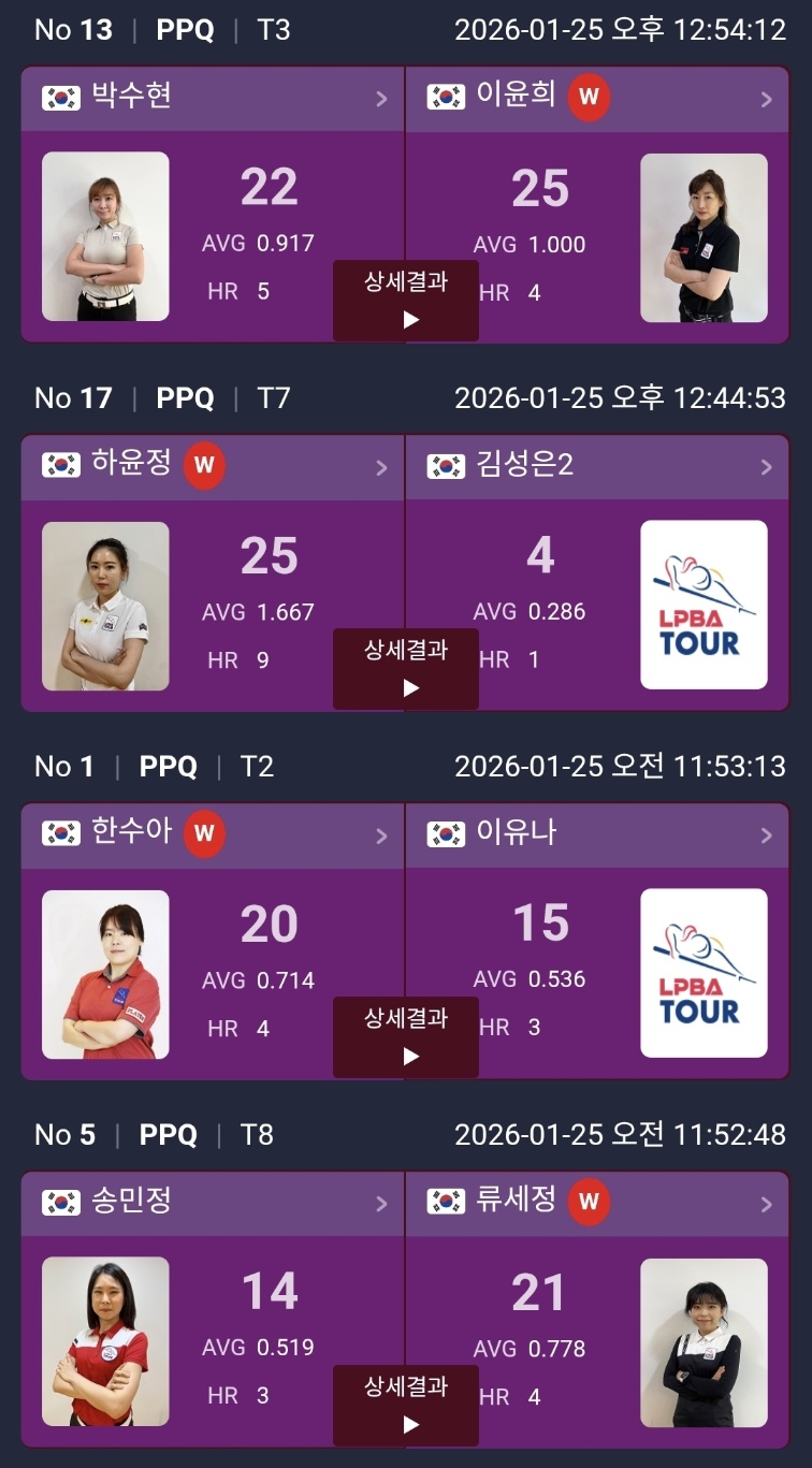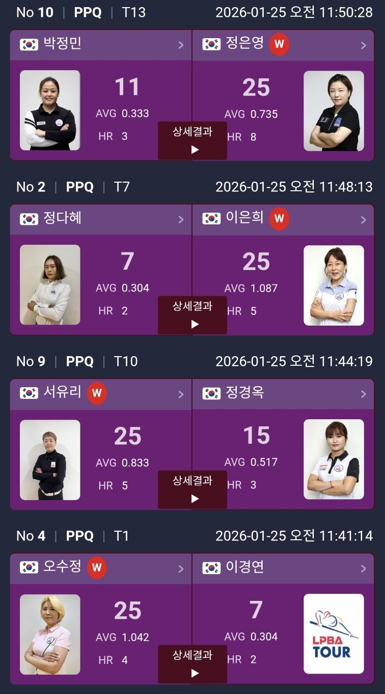 그리고 오늘 “기록이 강렬했다”는 말이 나올 정도로 눈에 띈 선수는 이은희 선수였어요. 정다혜 선수 상대로 25:7, AVG 1.087을 기록했는데, 이 방식에서 1점대 평균은 정말 쉽지 않거든요. 경기 집중도가 확실히 좋아 보였어요.