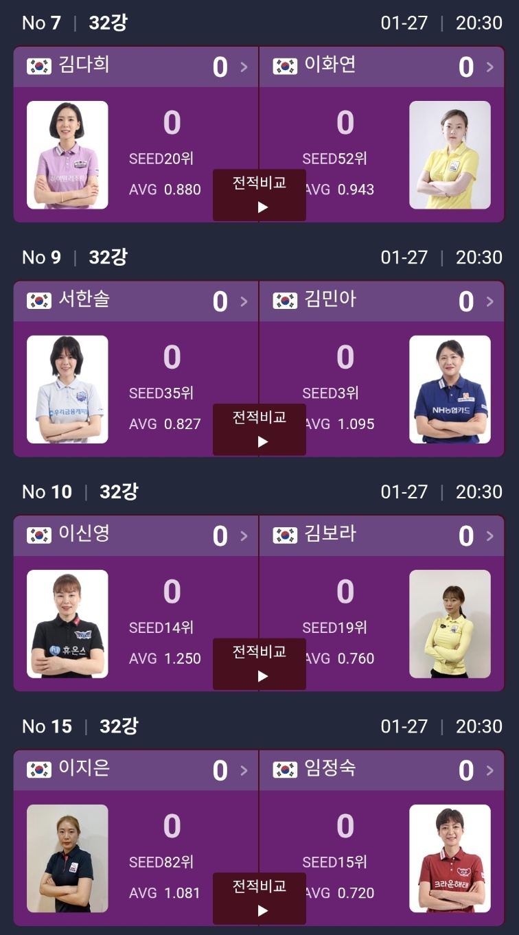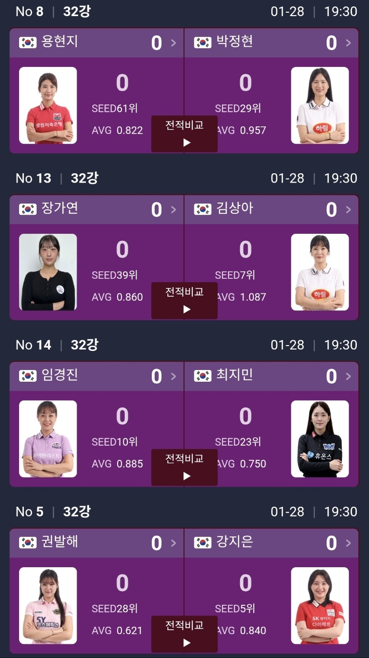 이 밖에도 김다희 vs 이화연, 서한솔 vs 김민아, 이신영 vs 김보라, 이지은 vs 임정숙, 용현지 vs 박정현, 장가연 vs 김상아, 임경진 vs 최지민, 권발해 vs 강지은, 심지유 vs 최정선, 김보미 vs 히가시우치, 정수빈 vs 이우경까지 32강 대진이 꽤 촘촘하게 짜였습니다.
