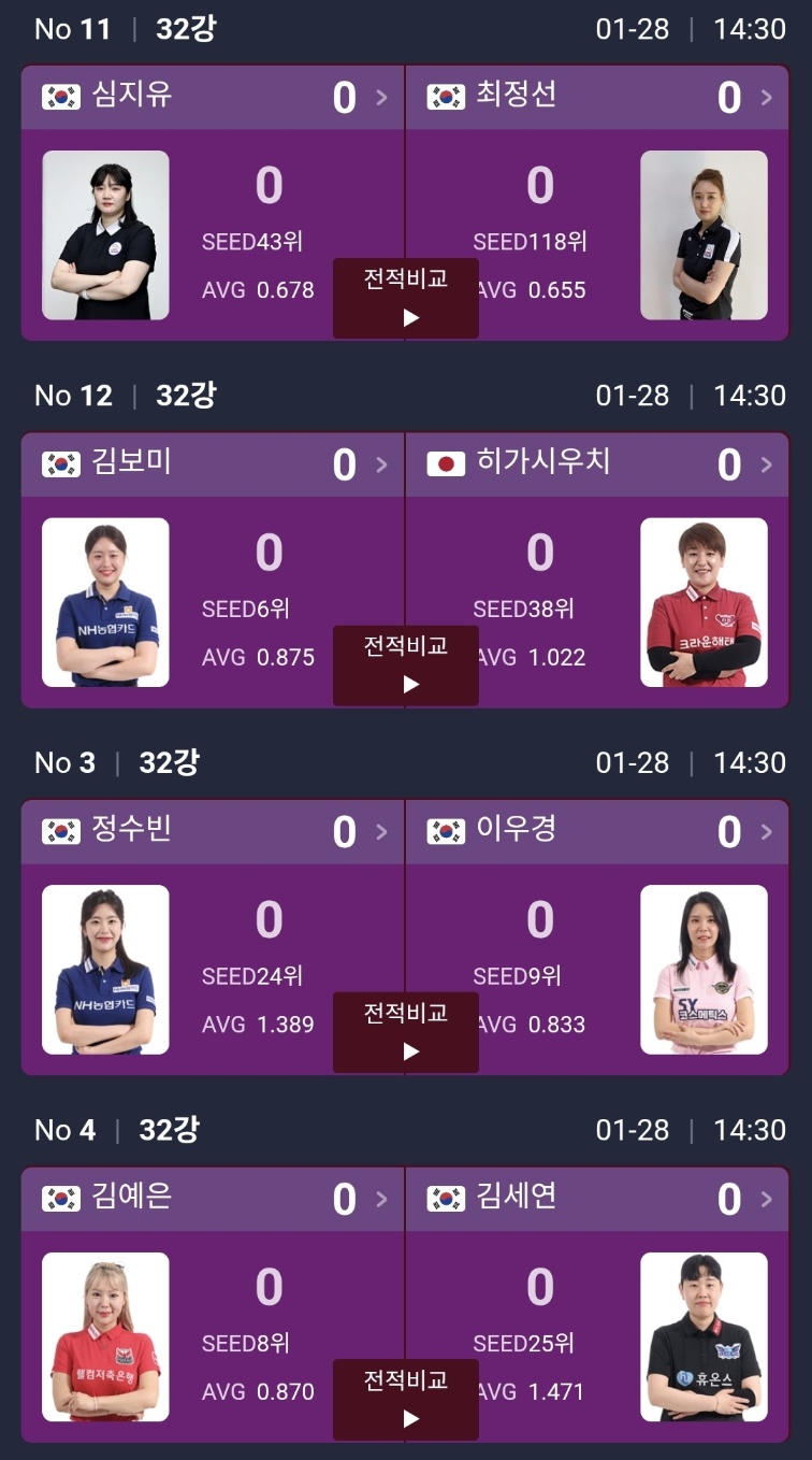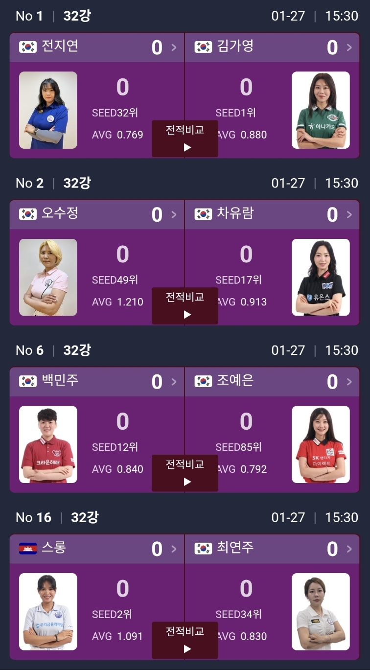 가장 먼저 눈에 띄는 건 전지연 vs 김가영이에요. 시드 1위 김가영을 상대로 전지연이 어떤 흐름을 만들지가 관전 포인트죠. 오수정 vs 차유람도 재미있는 카드예요.