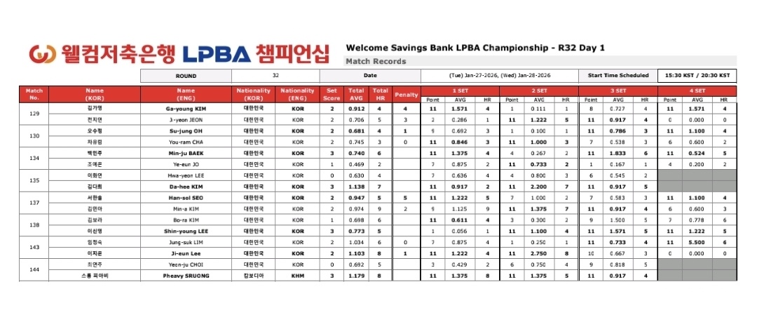 LPBA 32강은 4전 3선승제 세트제로 진행되기 때문에, 흐름을 한 번 놓치면 만회가 쉽지 않습니다. 1일차 경기들에서도 초반 세트를 먼저 내준 뒤 끝내 리듬을 찾지 못한 선수들이 적지 않았습니다.
