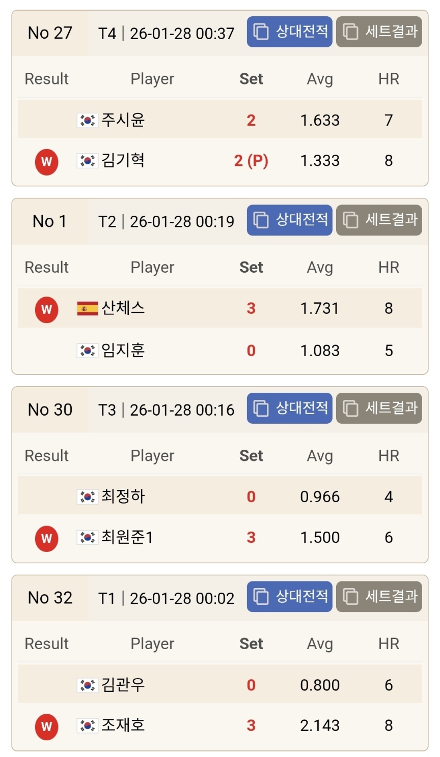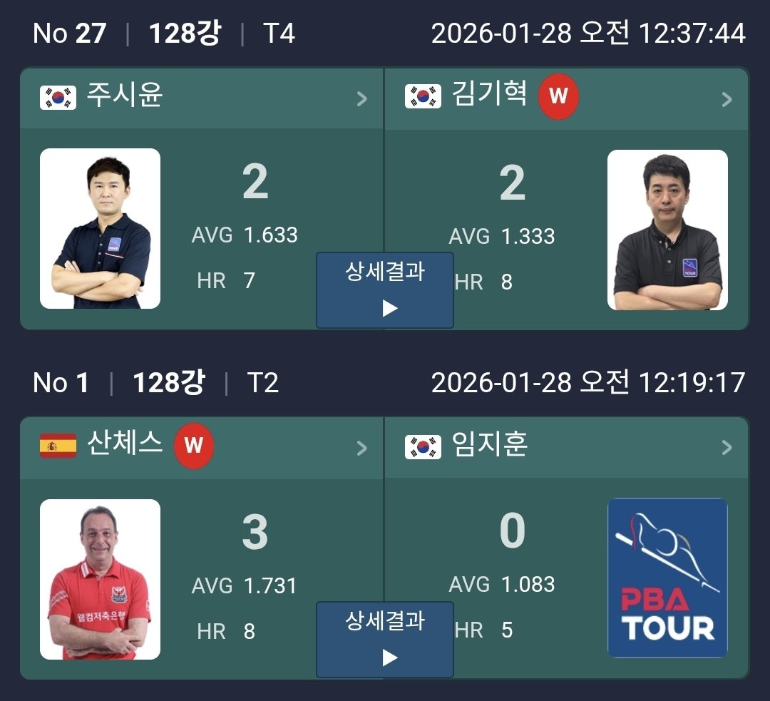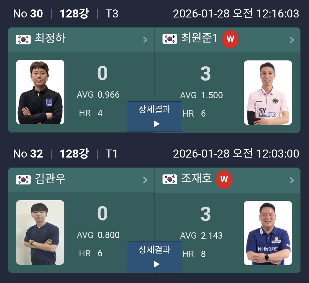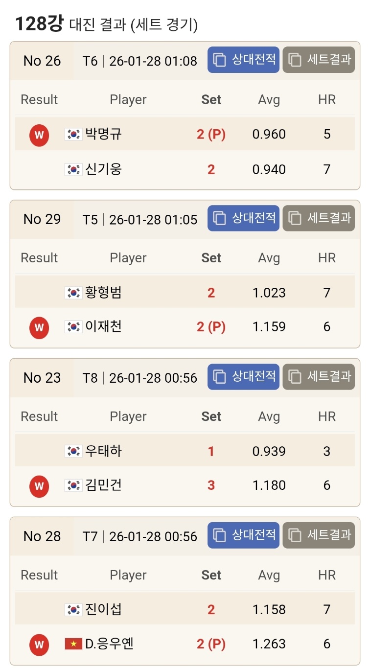 이 밖에도 박명규와 신기웅의 경기, 주시윤과 김기혁의 경기처럼 승부치기까지 이어진 접전들이 이어지며 128강다운 변수를 보여줬습니다. 한 번 흐름을 놓치면 바로 세트 스코어가 뒤집히는 장면이 반복됐습니다.