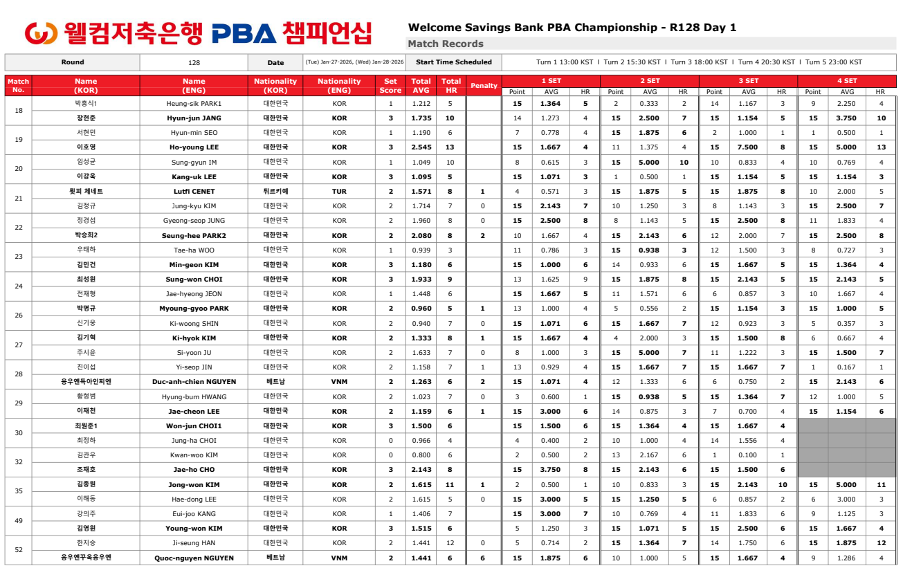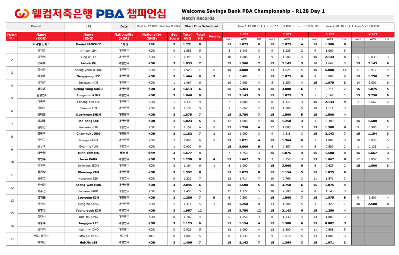 웰컴저축은행 PBA 챔피언십 128강 4턴 경기결과, 새벽까지 이어진 승부