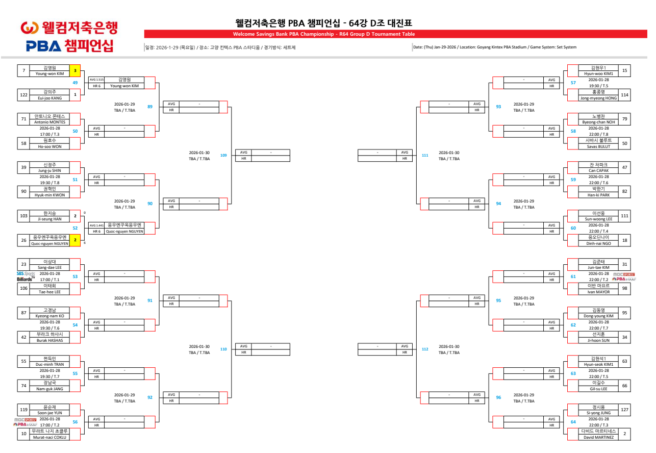 1일차 결과를 반영해 웰컴저축은행 PBA 챔피언십 64강 대진표가 1차로 정리됐습니다.