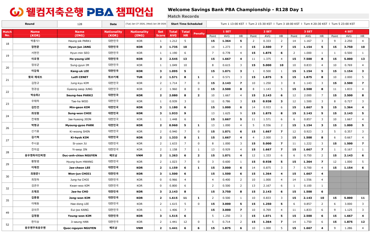 1월 27일 128강 웰컴저축은행 PBA 챔피언십 1일차 경기결과에서는 베테랑과 신예의 경계가 크게 느껴지지 않았습니다. 공격적인 선택이 잦아졌고, 수비 위주의 운영만으로는 버티기 어려운 분위기였습니다.