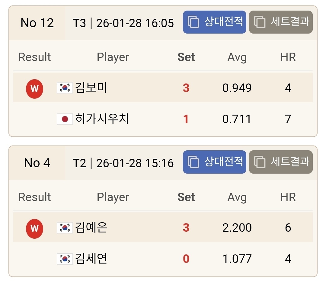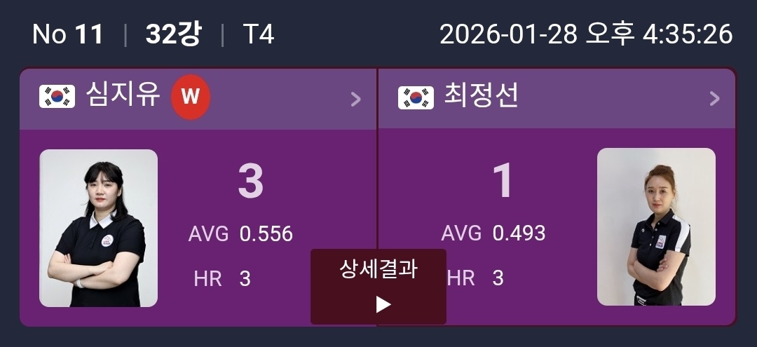 김예은 선수는 김세연을 상대로 3대0 완승을 거두며 이번 1턴 경기 중 가장 강한 존재감을 남겼습니다. 평균 애버리지 2.200이라는 수치에서 보이듯, 초반부터 경기 주도권을 놓치지 않은 모습이 돋보였습니다.