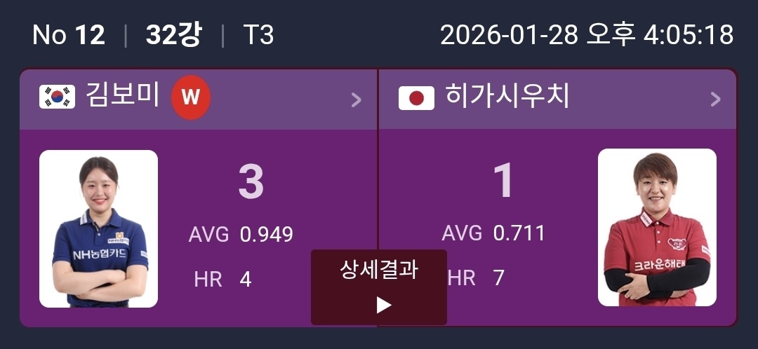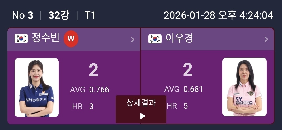 | 웰컴저축은행 LPBA 챔피언십 32강 1일차 경기결과로 본 16강 대진표 정리 (0) | 2026.01.28 |
