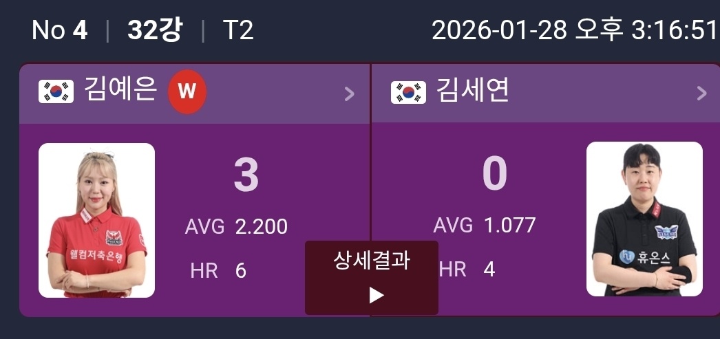 김예은 선수는 김세연을 상대로 3대0 완승을 거두며 이번 1턴 경기 중 가장 강한 존재감을 남겼습니다. 평균 애버리지 2.200이라는 수치에서 보이듯, 초반부터 경기 주도권을 놓치지 않은 모습이 돋보였습니다.
