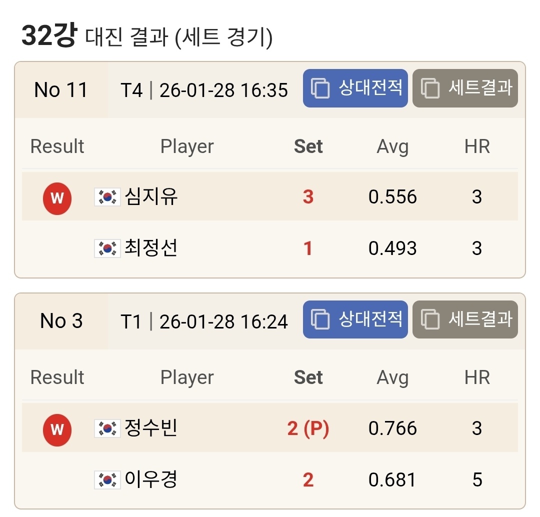 | 웰컴저축은행 LPBA 챔피언십 32강 1일차 경기결과로 본 16강 대진표 정리 (0) | 2026.01.28 |