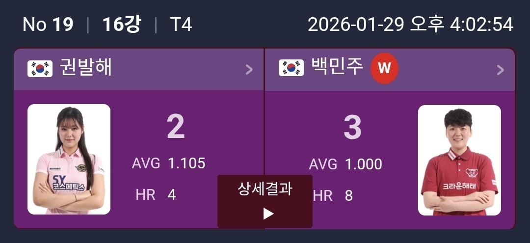 | 웰컴저축은행 LPBA 챔피언십 32강 2일차 1턴 결과 정리 (0) | 2026.01.28 |