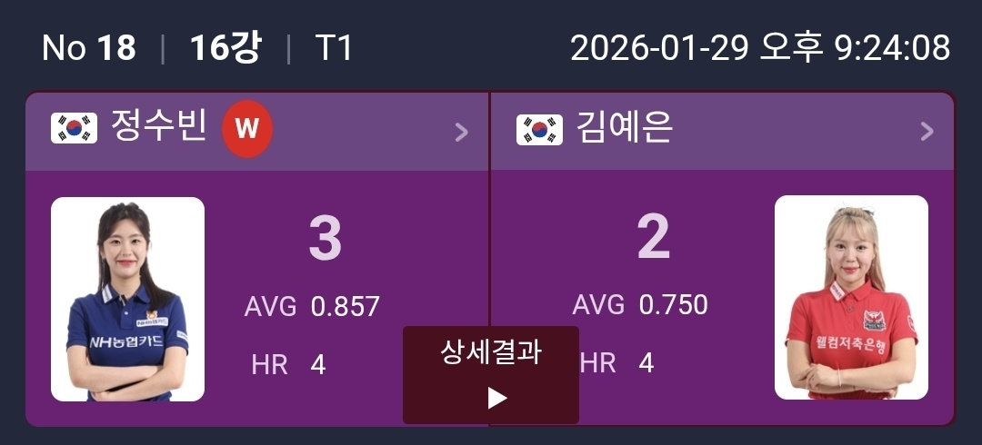 | 웰컴저축은행 LPBA 챔피언십 32강 2일차 1턴 결과 정리 (0) | 2026.01.28 |
