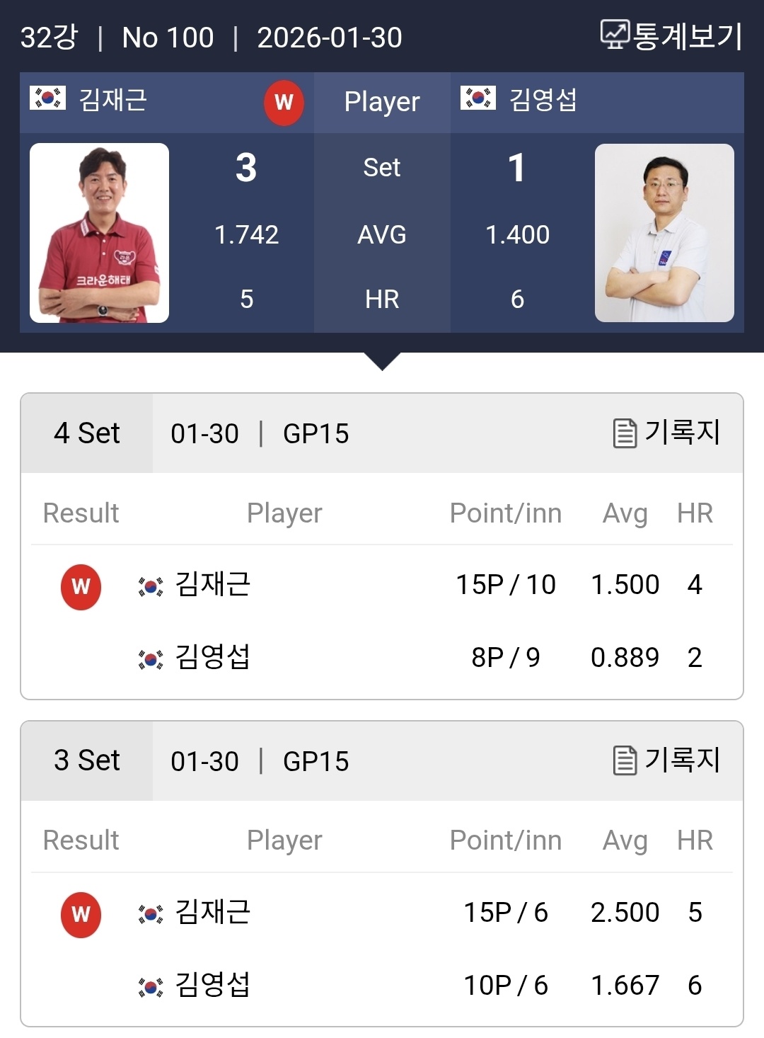 김재근 선수는 김영섭 선수와의 경기에서 세트스코어 3대1로 승리했습니다. 김재근 선수는 안정적인 초반 운영으로 흐름을 잡았고 상대에게 긴 추격 기회를 주지 않았습니다. 김영섭 선수 역시 득점력에서는 나쁘지 않았지만 세트 중반 이후 결정적인 한 큐에서 아쉬움이 남았습니다.