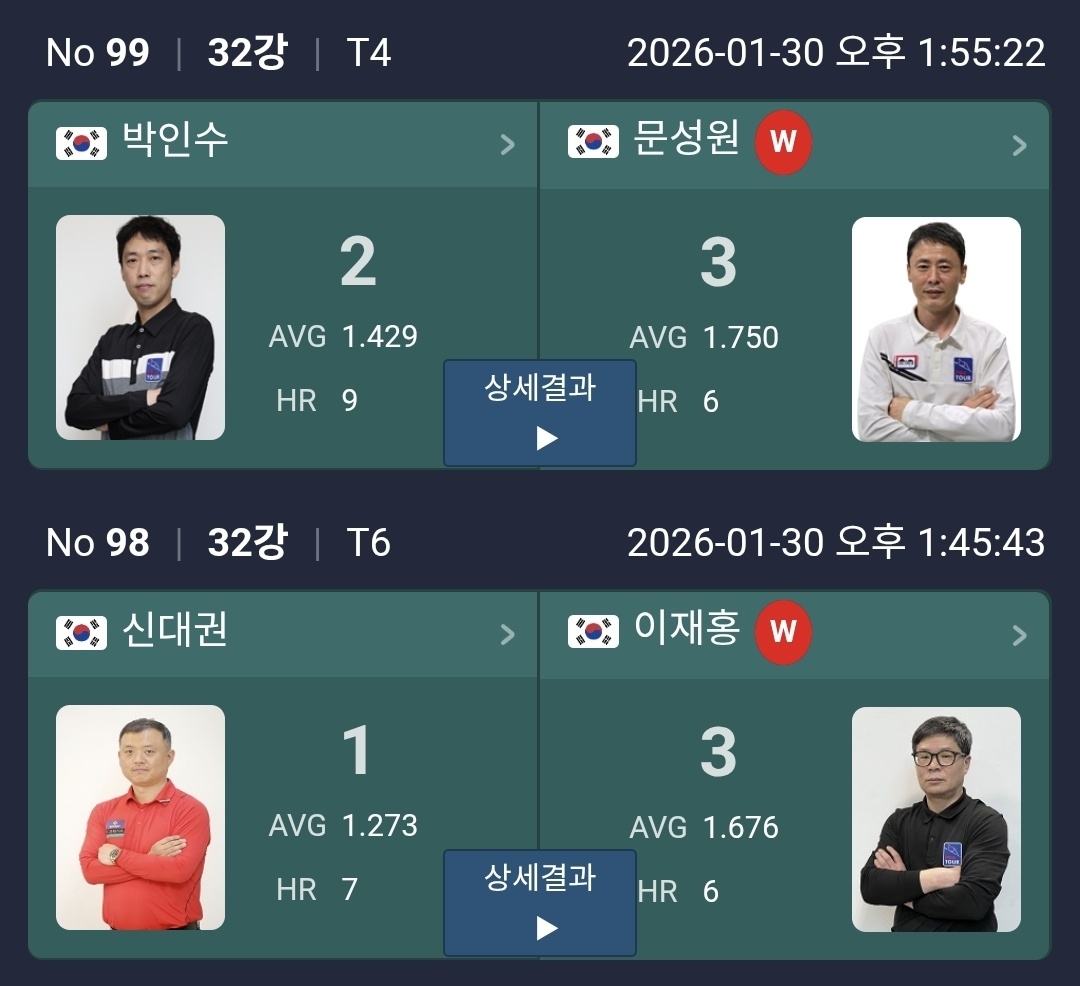 | 웰컴저축은행 PBA 챔피언십 32강 결과에 따른 16강 대진표 정리 (0) | 2026.01.31 |