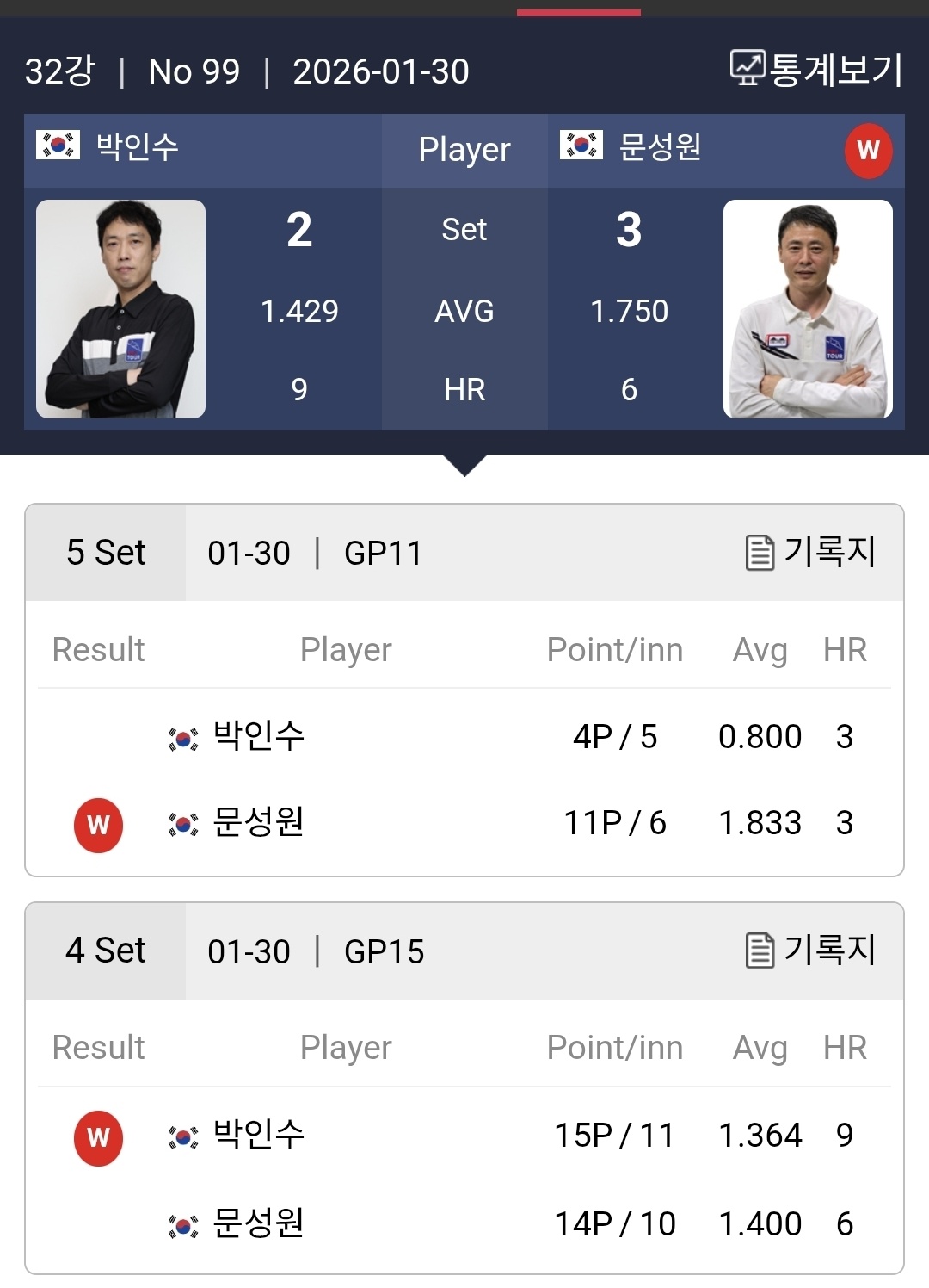 박인수 선수와 문성원 선수의 경기는 끝까지 이어진 접전이었습니다. 결과는 문성원 선수가 3대2로 승리했습니다. 박인수 선수는 한 방 능력을 여러 차례 보여줬지만 세트 후반 집중력에서 미세한 차이가 갈렸습니다. 문성원 선수는 큰 흔들림 없이 매 세트 기본 점수를 쌓아가며 흐름을 지켰습니다.