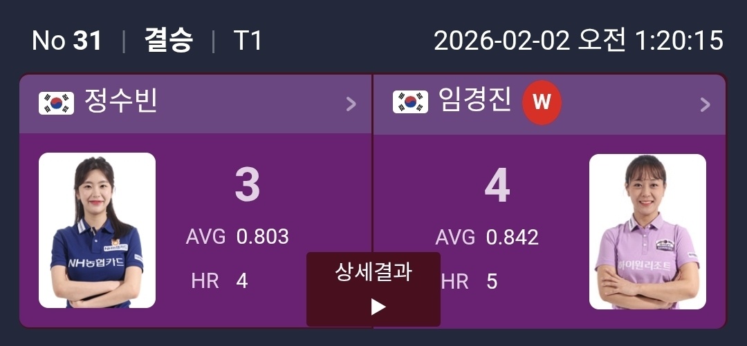 전체 경기 애버리지는 임경진 0.842, 정수빈 0.803으로 큰 차이는 없었지만, 결정적인 순간의 득점이 승부를 갈랐습니다.