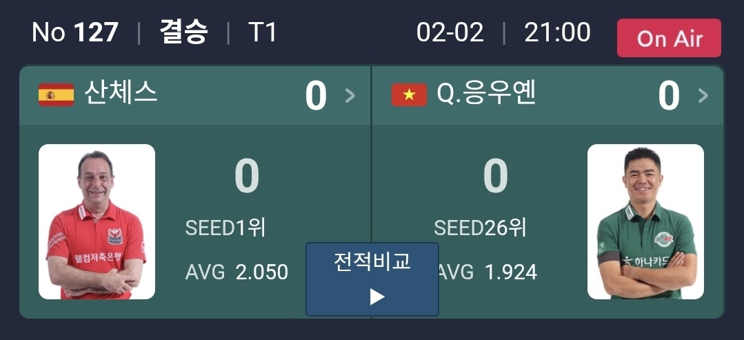 산체스는 올 시즌 PBA 챔피언십에서 이미 2차례 우승을 경험한 선수로, 이번 결승은 세 번째 우승 도전입니다. 반면 응우옌꾸옥은 개인 우승 기록은 없지만, 올 시즌 PBA 팀리그에서 하나카드 팀을 우승으로 이끈 핵심 전력입니다.